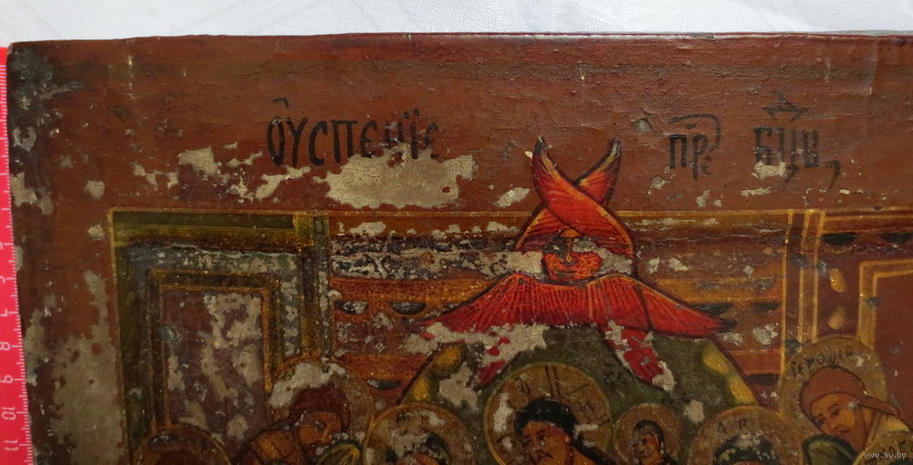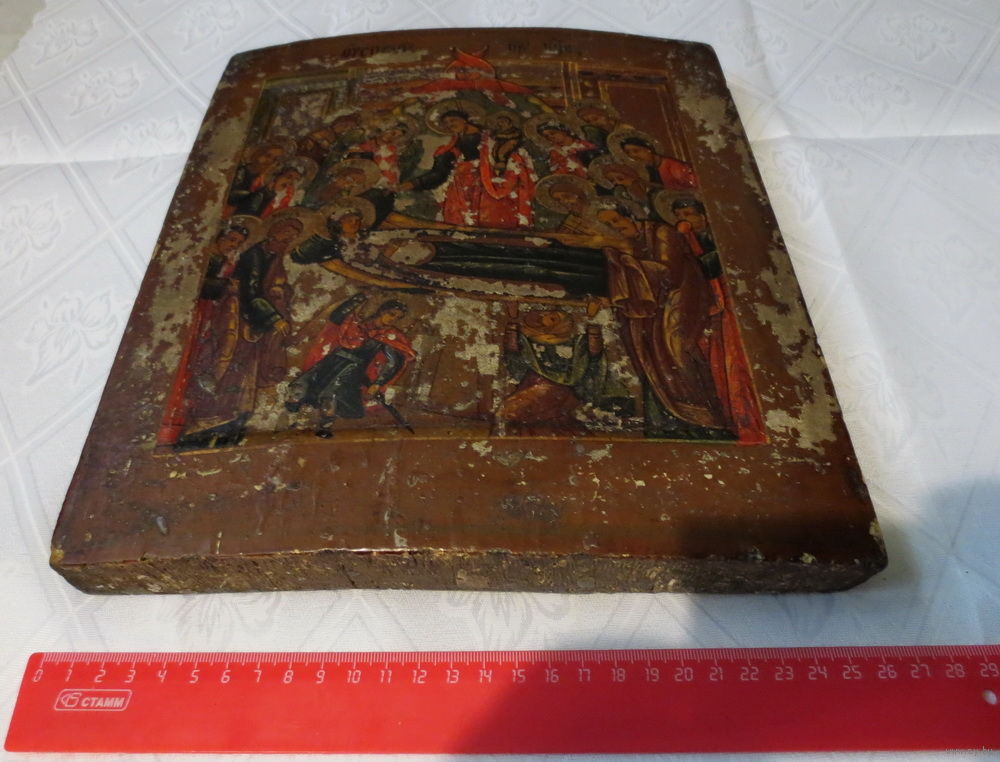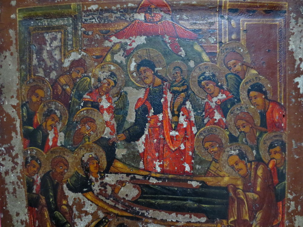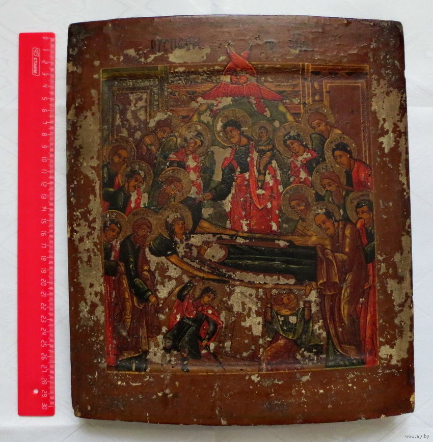 Икона.Успение Пресвятой Богородицы.Конец 17в.-начало 18в.(датирование: особенности письма сюжета тех времен + возможно год 16..? на торце). Большая: 30см.х26см. Оригинальная,красивая,без вмешательств.