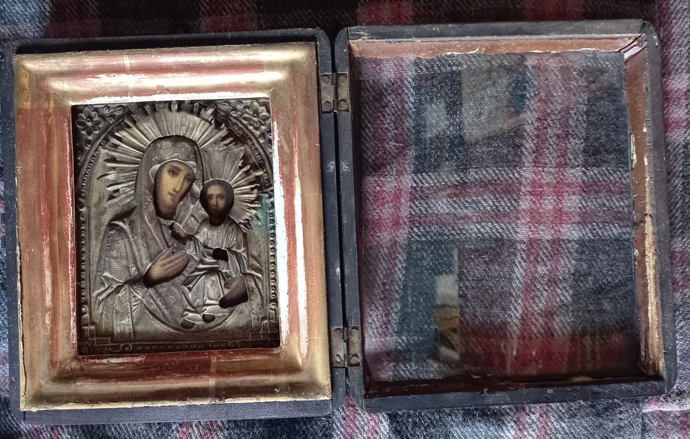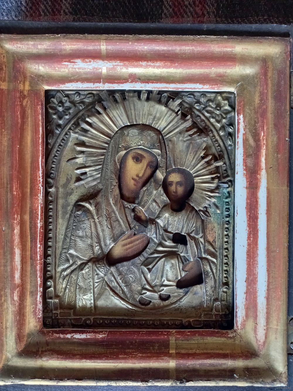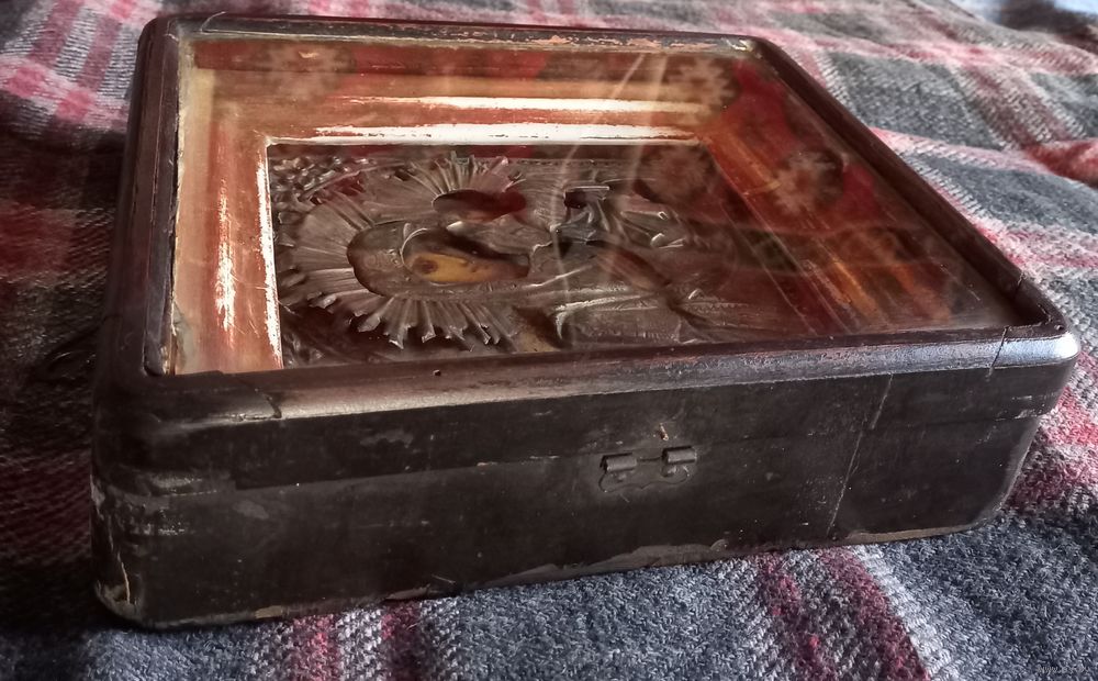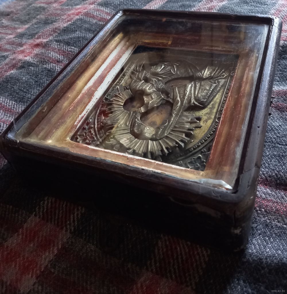 Икона старинная 19 век под стеклом 25х22 с киотом размер толщина 7см хорошее состоян. Оклад посеребрян.