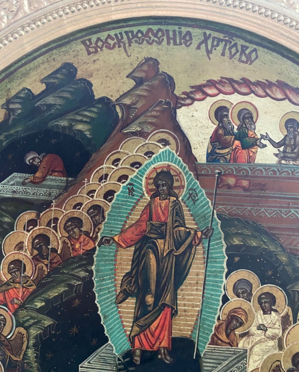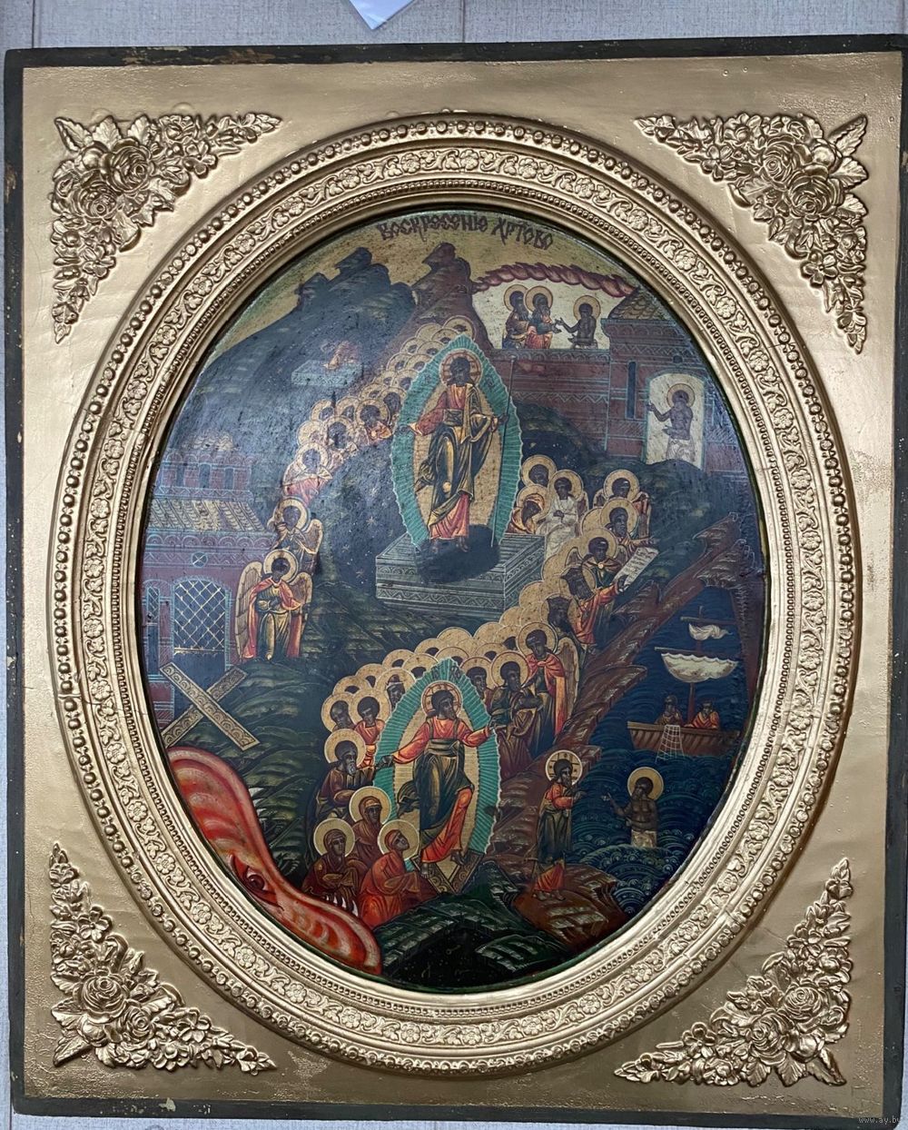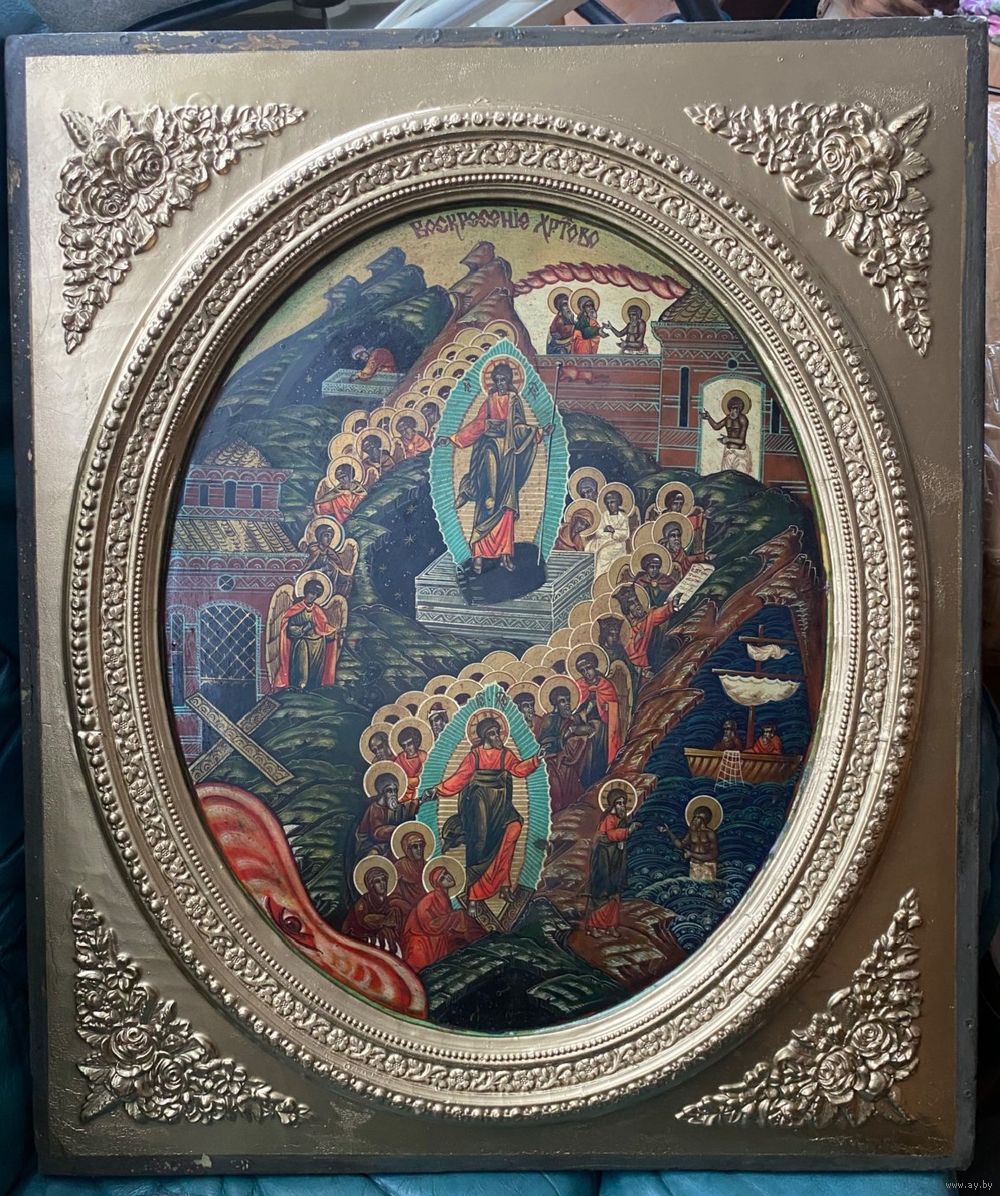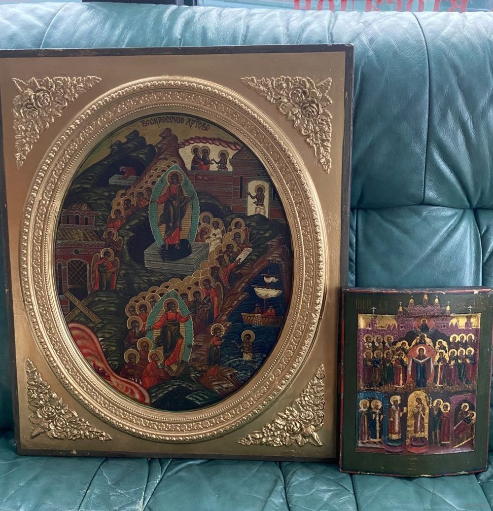 Большая храмовая икона в хорошем сохране!!! Размер 60 на 50 см. Материал, дерево, гипс. Живопись, начало 20 го века.