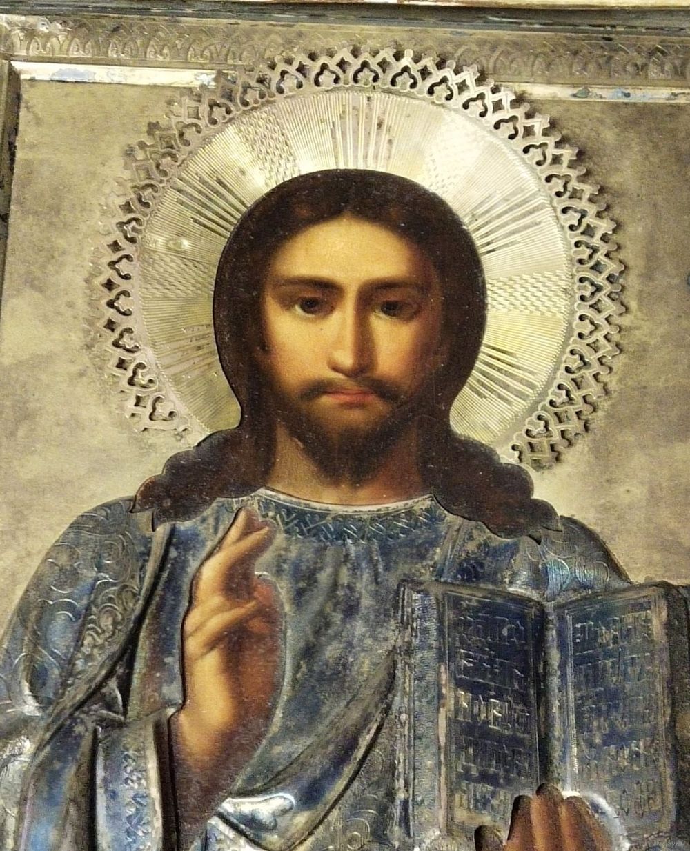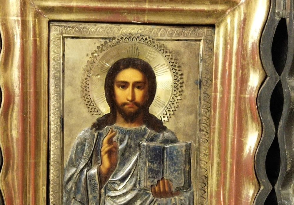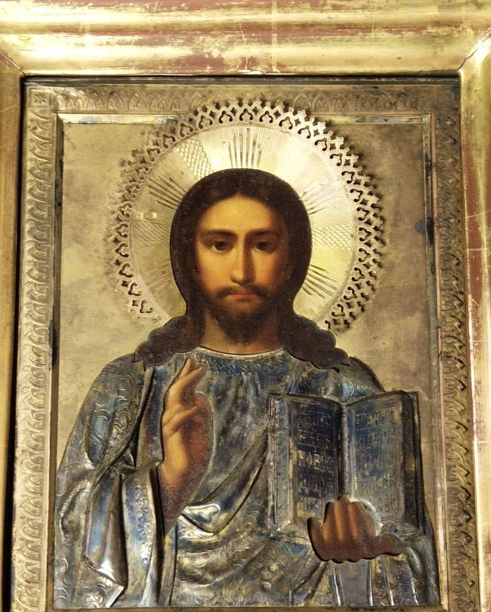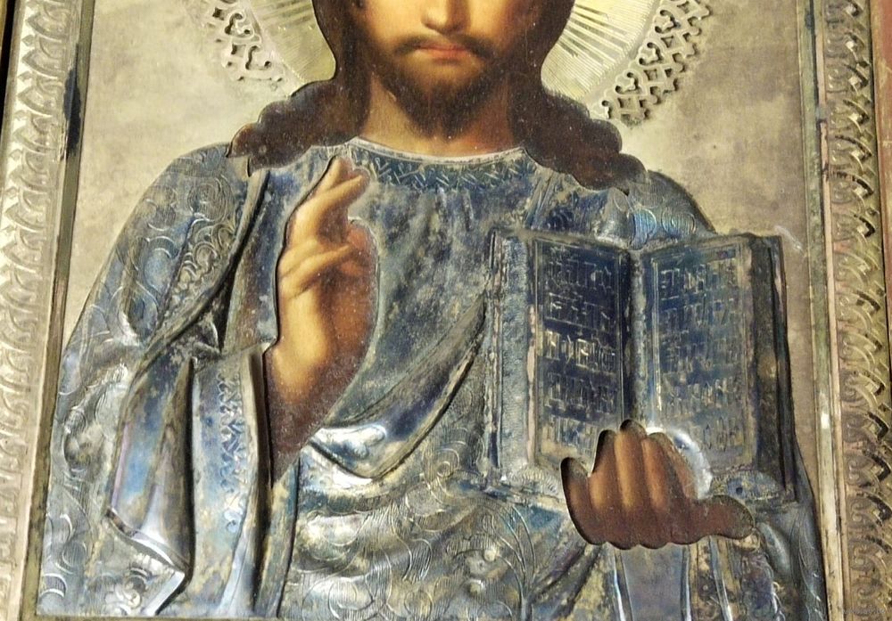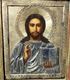 Икона " Вседержитель ". 19-й век. Оклад серебро 84 пр. Киот размером 34 на 30 см. Размер иконы 22 на 17 см. Отличное письмо. Отличное состояние.