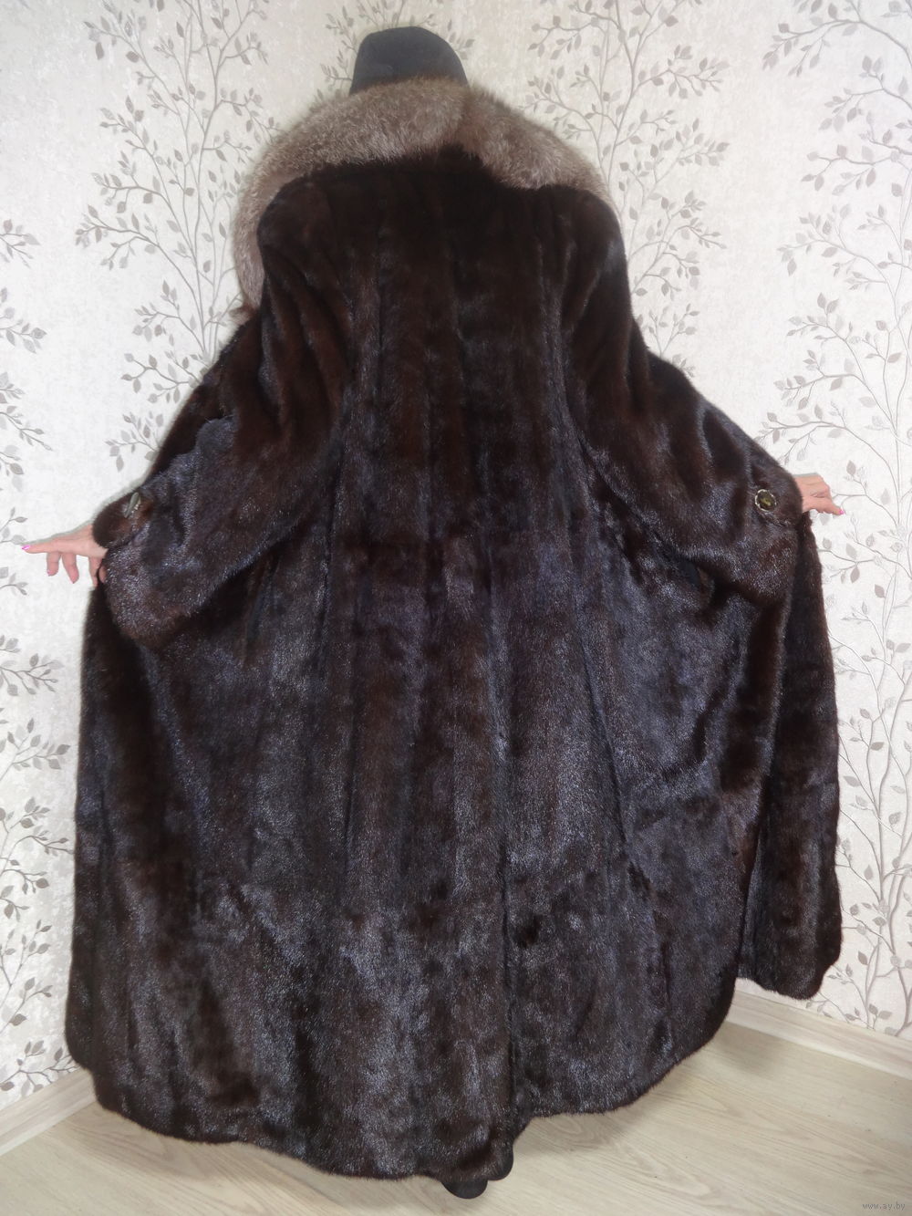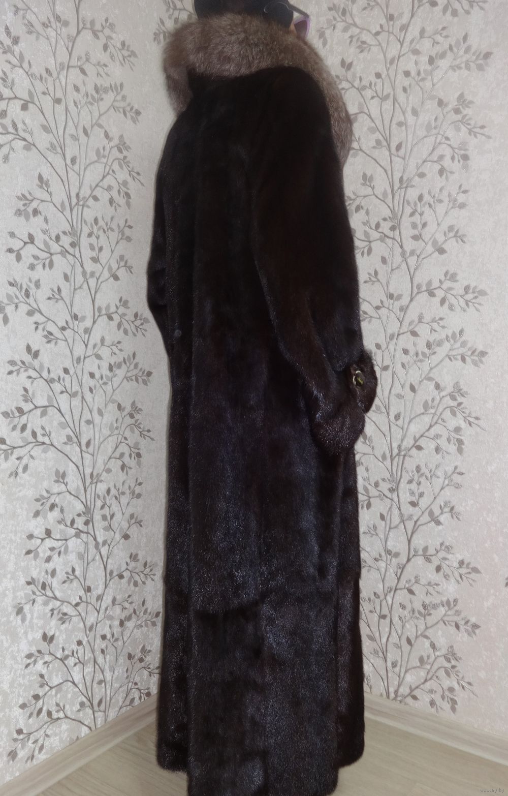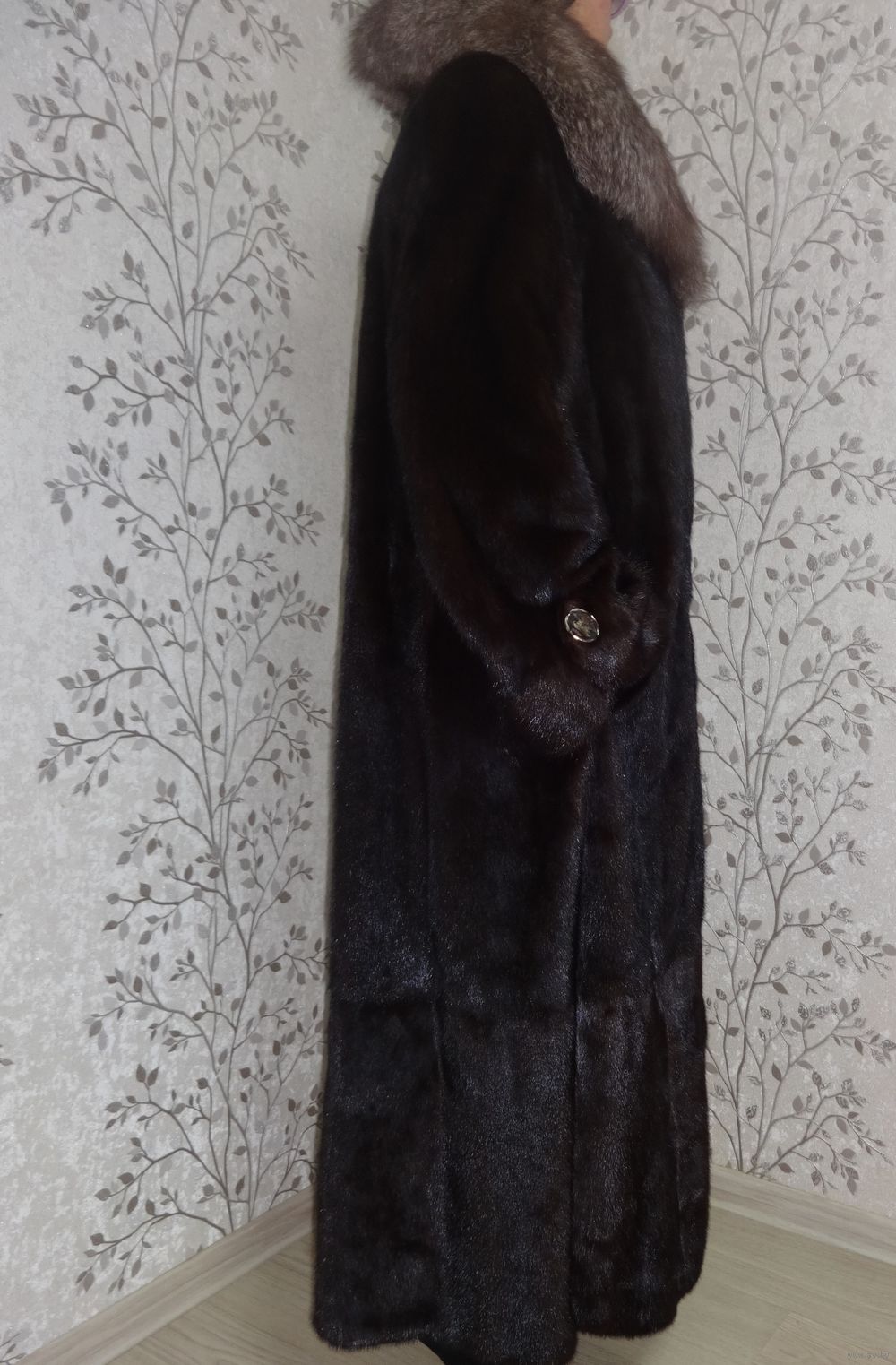 Итальянский дизайн марки "Image". Длинная "в пол" шуба норковая с шикарным воротником из черно-бурой лисы. Мех упругий, с глянцевым блеском, натурального темно-коричневого цвета (до черного) без обломов ости, без потертостей, в отличном состоянии. Качество исполнения ! Объем груди у шубы - 114 см.