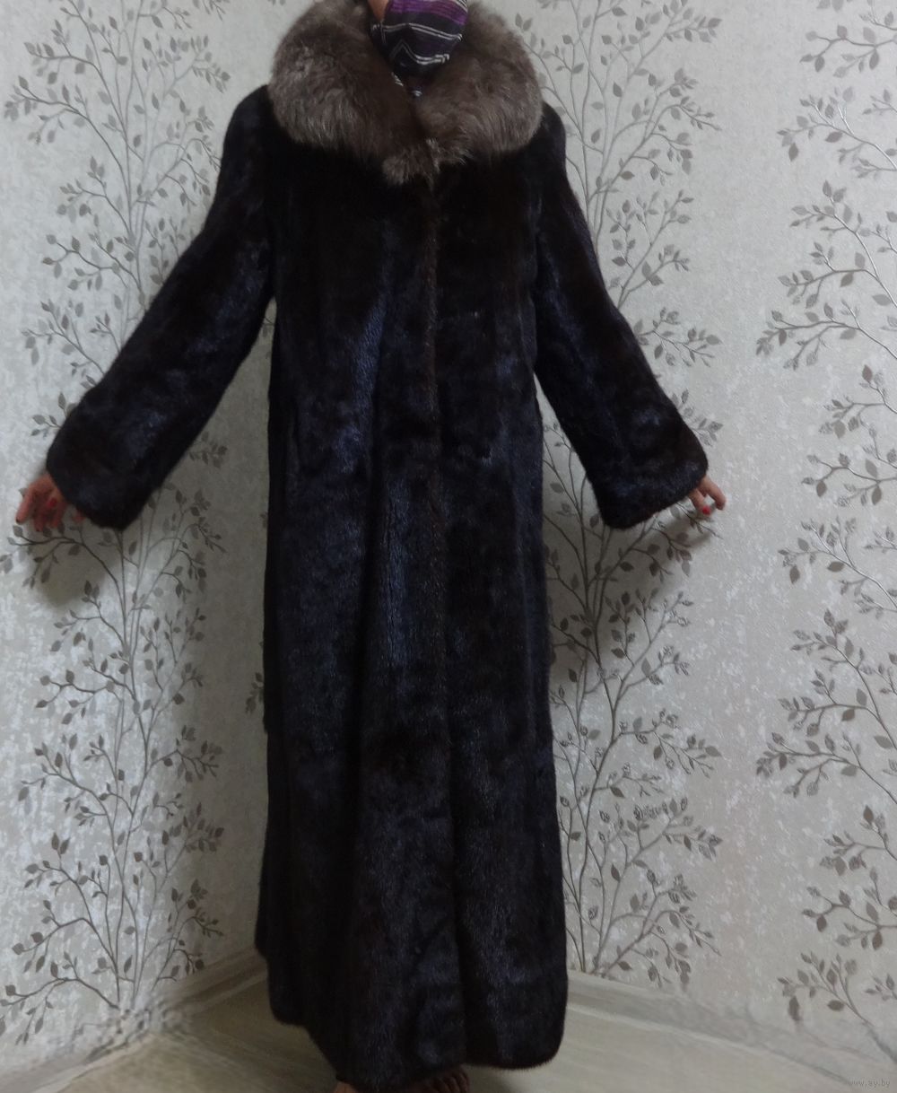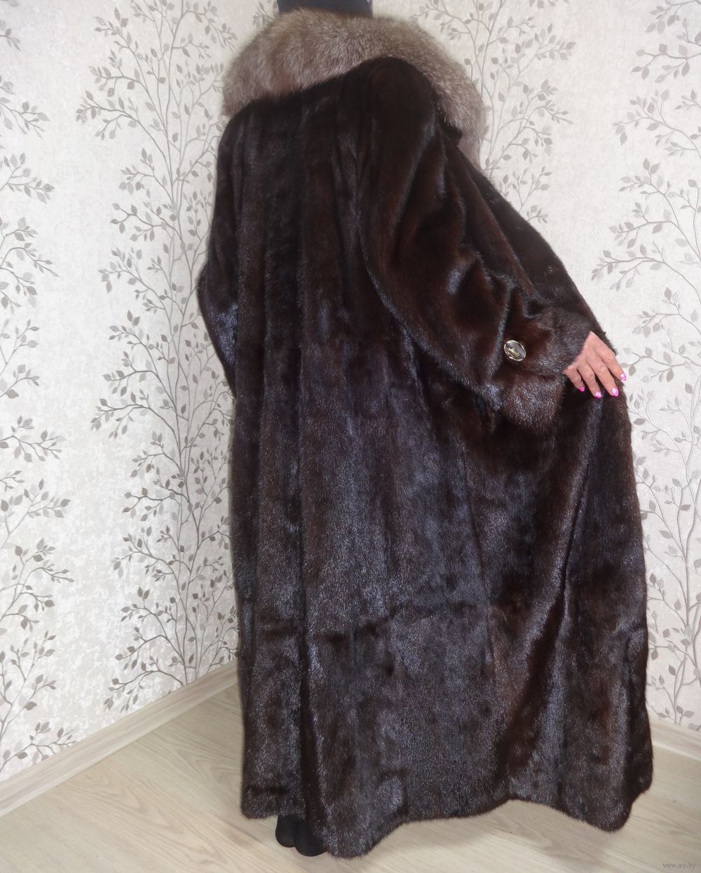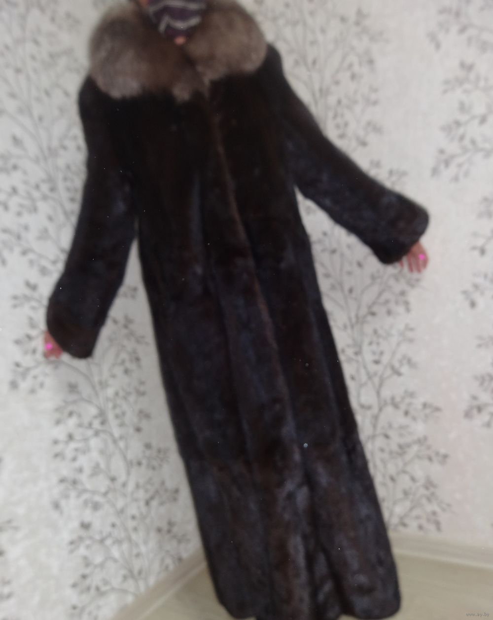 Итальянский дизайн марки "Image". Длинная "в пол" шуба норковая с шикарным воротником из черно-бурой лисы. Мех упругий, с глянцевым блеском, натурального темно-коричневого цвета (до черного) без обломов ости, без потертостей, в отличном состоянии. Качество исполнения ! Объем груди у шубы - 114 см.