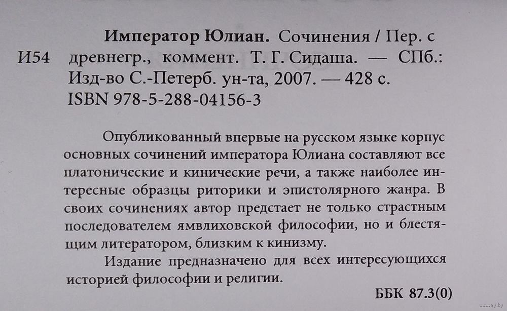 Император Юлиан. Сочинения. Перевод с древнегреческого и комментарии Т.Г. Сидаша. СПб. Издательство СПбГУ 2007г. 428 с. Твердый переплет, Обычный формат.