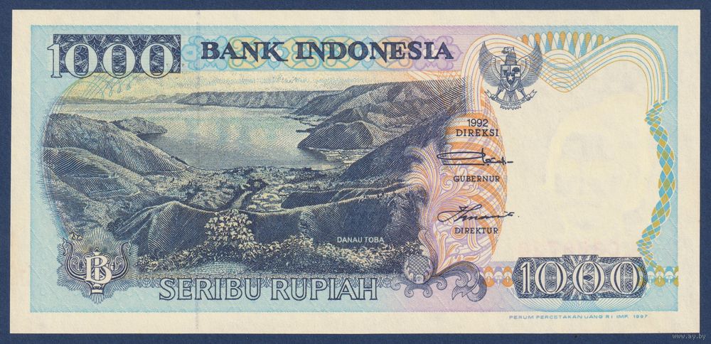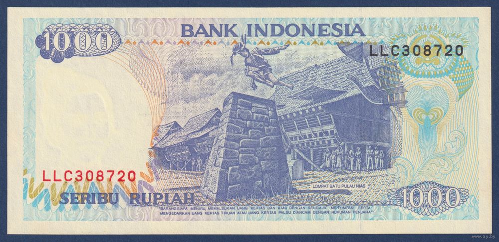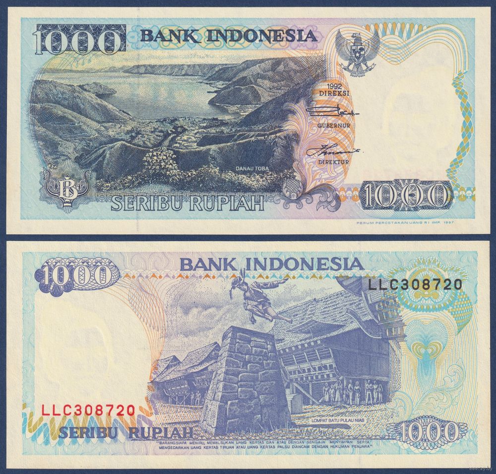 Индонезия, 1000 рупий 1992 (1997) г., P-129f (LLC, озеро Тоба, прыжки через камень - обряд инициации мальчиков), UNC