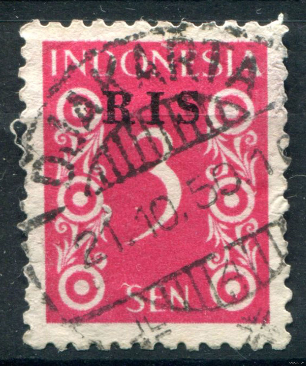 Индонезия - 1950г. - стандартный выпуск, цифры, архитектура, надпечатка RIS, 3 S - 1 марка - гашёная [Mi 42]. #4-W2-129-A-1