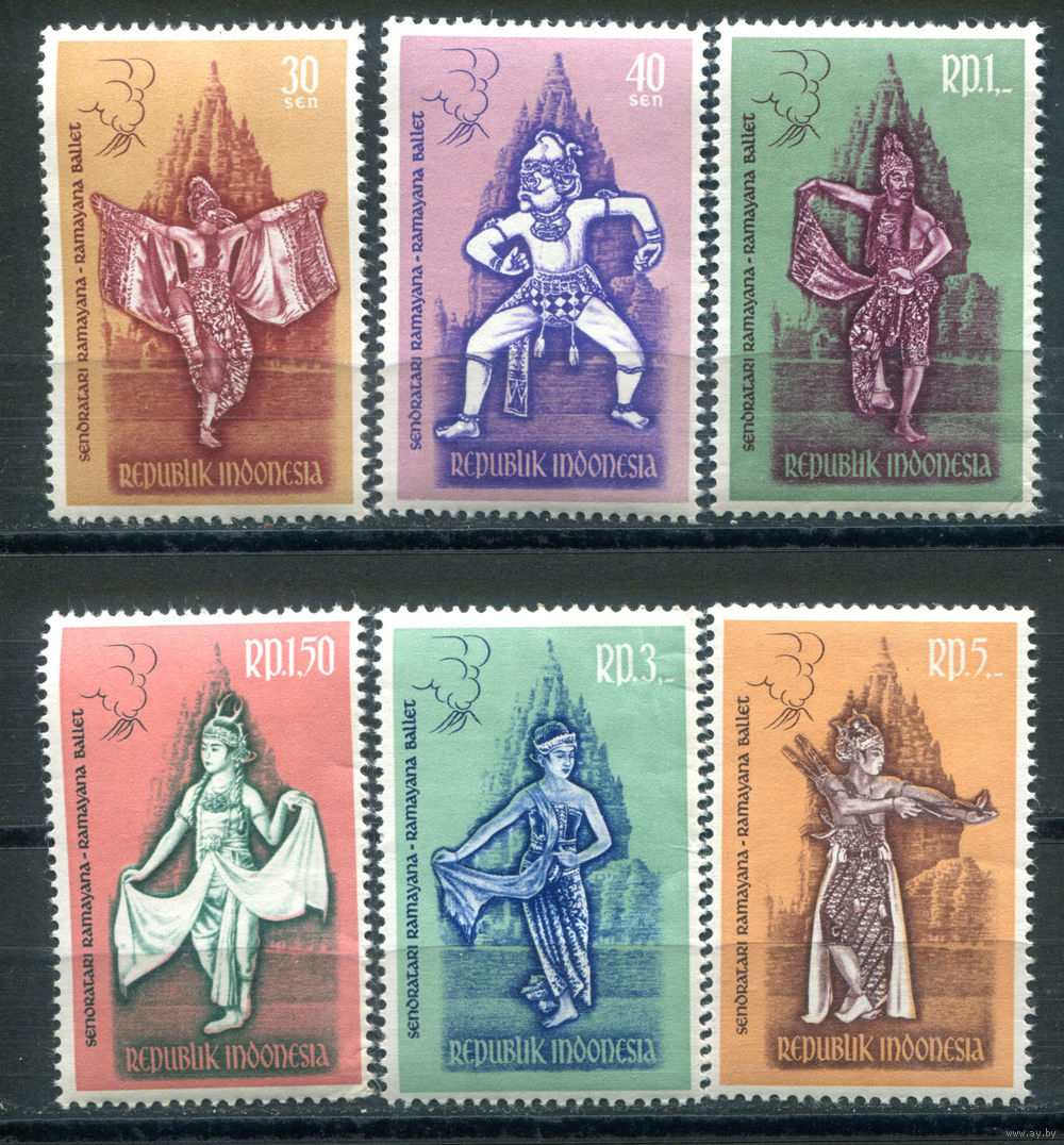![Индонезия - 1962г. - национальные костюмы, культура, искусство - 6 марок - полная серия, MNH, 1 марка с вмятинками на клее [Mi 323-328]. #4-W1-Z-1-5](https://s5-lot.aystatic.by/550x510/618/493/5040/5040493618_0.jpg)
