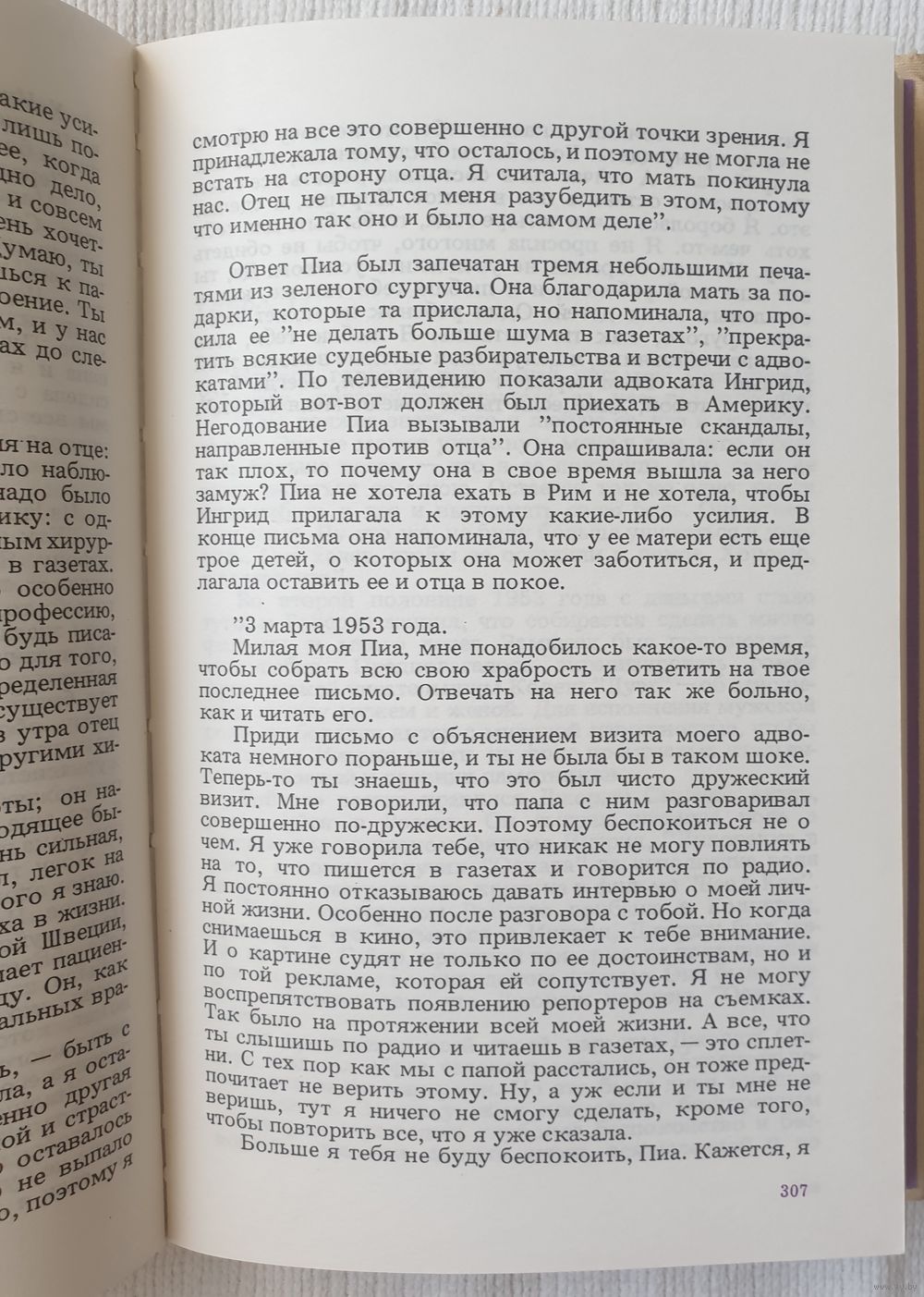 Книга написана одной из ведущих актрис мирового кино Ингрид Бергман (1915-1982) совместно с писателем А.Бёрджессом, известной советскому читателю по фильмам "Газовый свет", "Осенняя соната" и др.