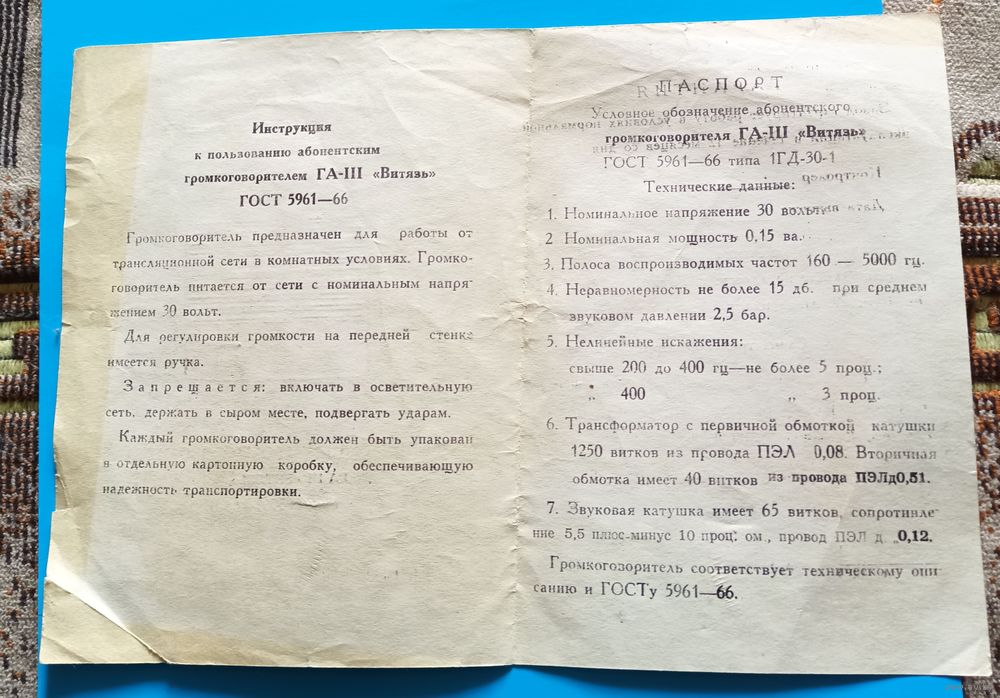 Инструкция к пользованию абонентским громкоговорителем "Витязь"