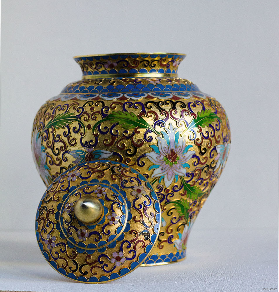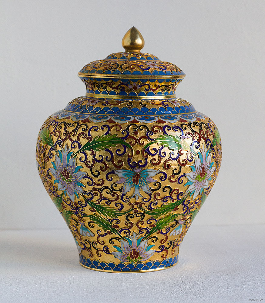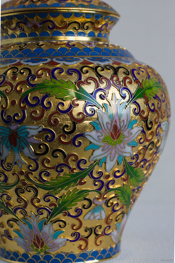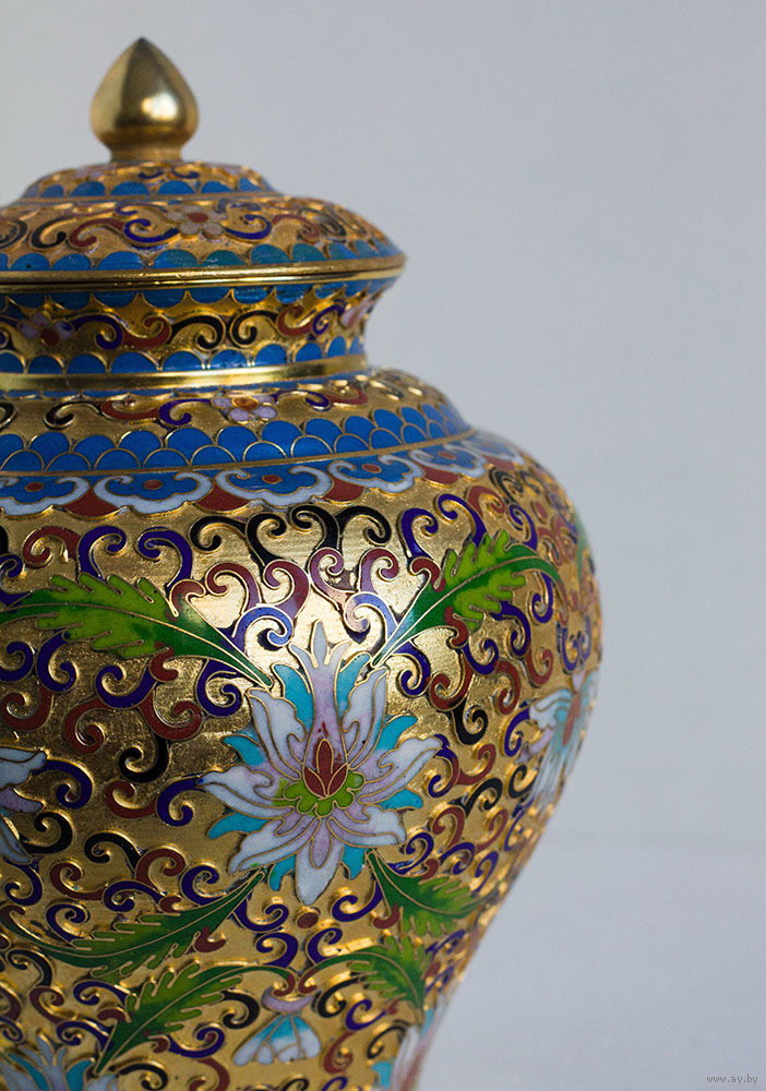 Ваза в технике многоцветной перегородчатой эмали по латуни. Полностью ручная работа. Плотный симметричный рисунок: традиционный цветочный декор (лотосы) на фоне канонического узора «облака».