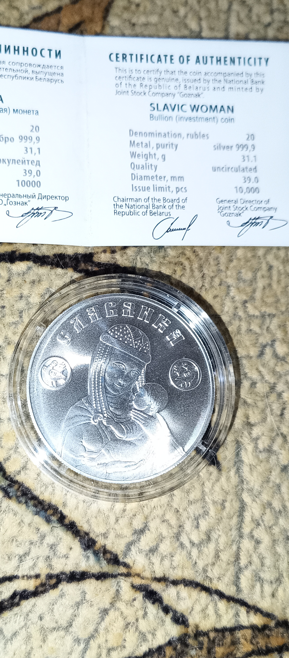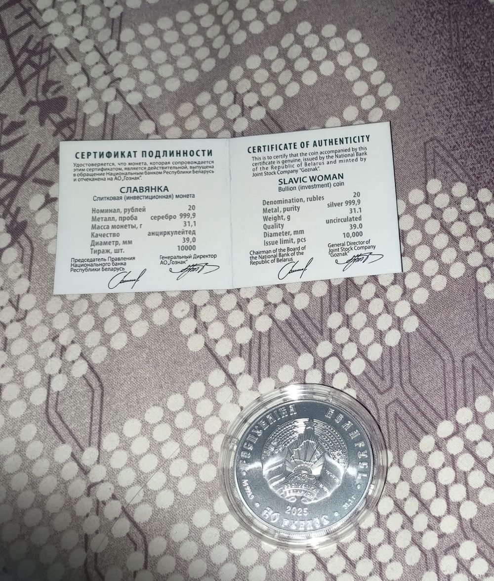 Серебряная монета – номиналом 20 рублей, качеством "анциркулейтед", из серебра пробы 999,9, массой 31,1 г.