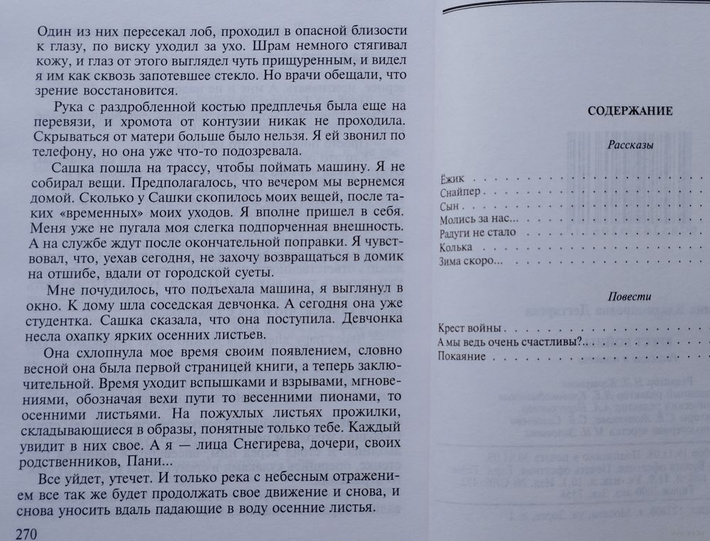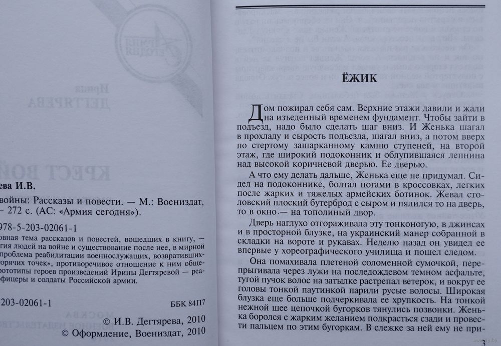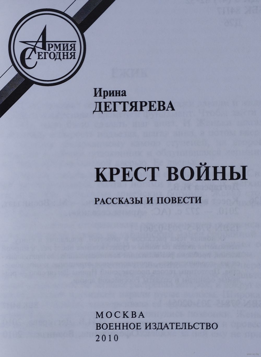 Тираж 3000 экз. 272 стр. Основная тема рассказов и повестей, вошедших в книгу, - психология людей на войне и существование после нее, в мирной жизни, проблема реабилитации военнослужащих, возвратившихся из «горячих точек», противоречивое отношение к ним общества. Прототипы героев произведений Ирины Дегтяревой - реальные офицеры и солдаты Российской армии.