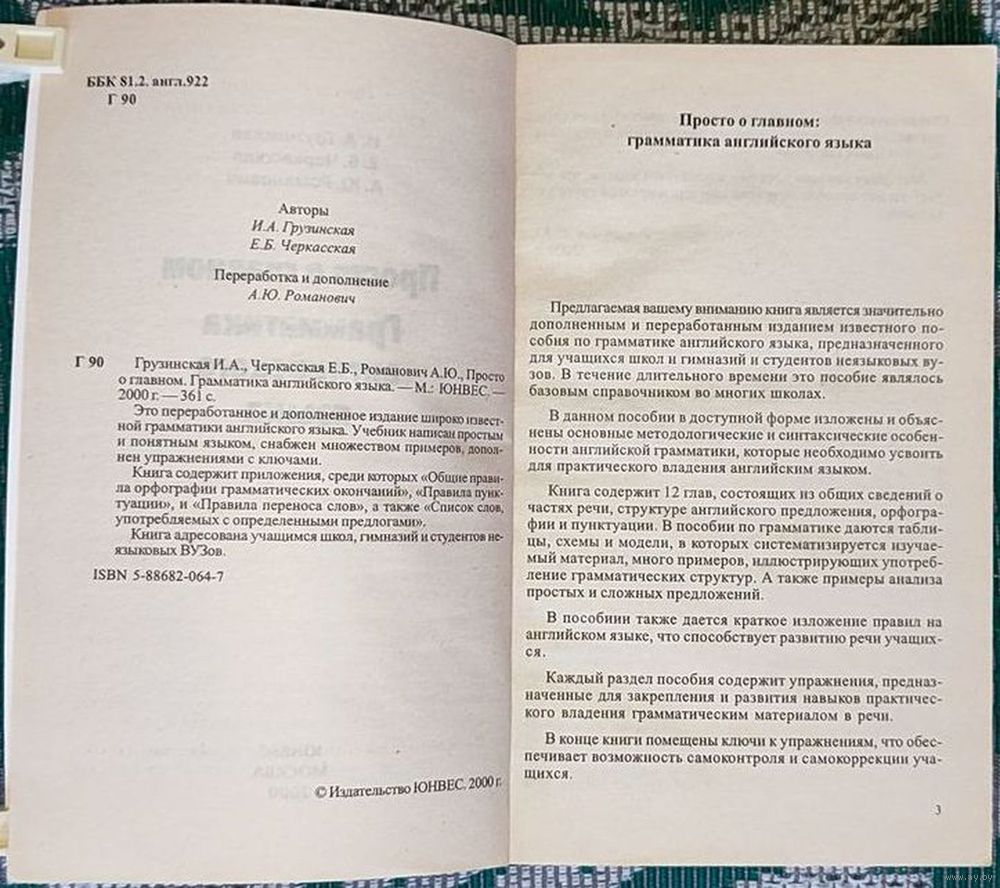 Книга «Просто о главном. Грамматика английского языка», авторами которой являются Ирина Алексеевна Грузинская, Елена Черкасская и Александра Романович, представляет собой практическое пособие, предназначенное для широкого круга изучающих английский язык. Пособие подходит как для начинающих, так и для тех, кто хочет систематизировать свои знания грамматики. Оно часто используется абитуриентами, студентами и слушателями курсов