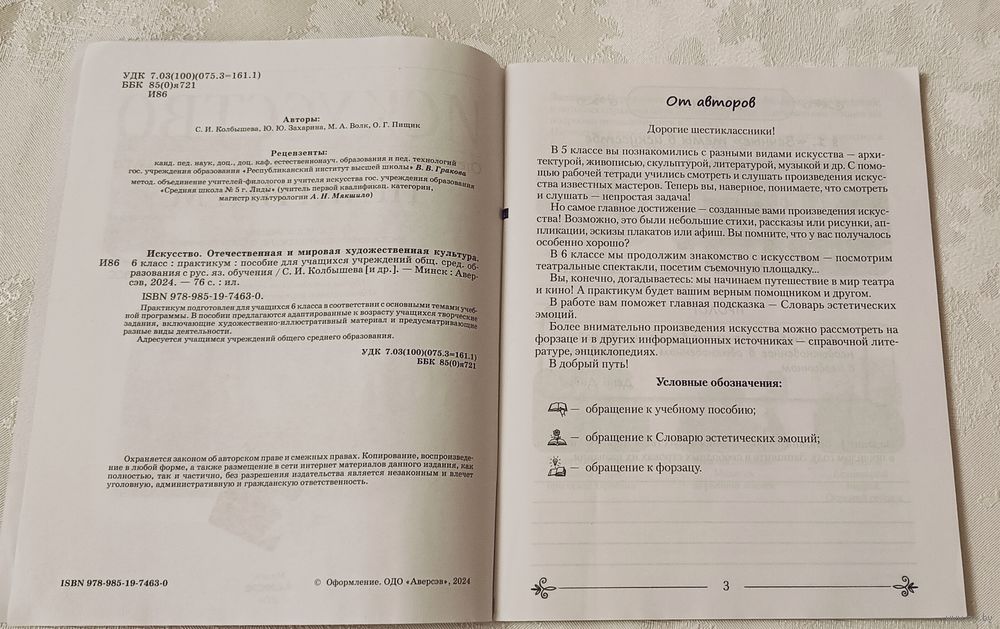 Искусство. Отечественная и мировая художественная культура. 6 класс: практикум: пособие для учащихся учреждений общ. сред. образования с рус. яз. обучения / С. И. Колбышева [и др.]. — Минск: Аверсэв, 2024. 76 с.: ил., мягкая обложка, обычный формат.