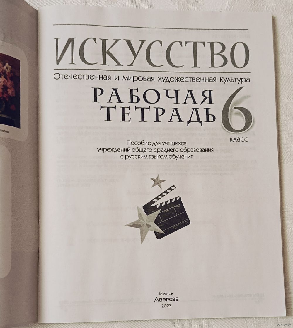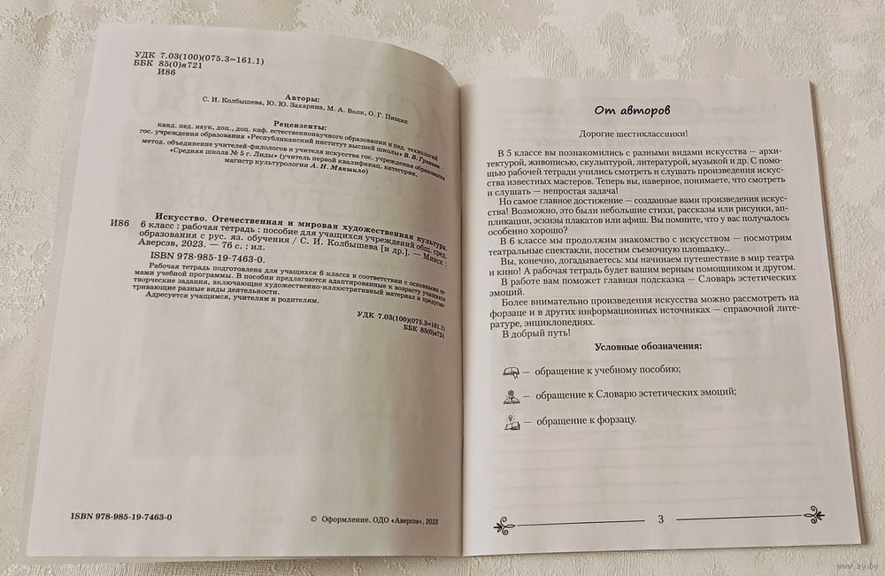 Искусство. Отечественная и мировая художественная культура. 6 класс: рабочая тетрадь: пособие для учащихся учреждений общ. сред. образования с рус. яз. обучения / С. И. Колбышева [и др.]. — Минск: Аверсэв, 2023. - 76 с.: ил. Мягкая обложка, обычный формат.