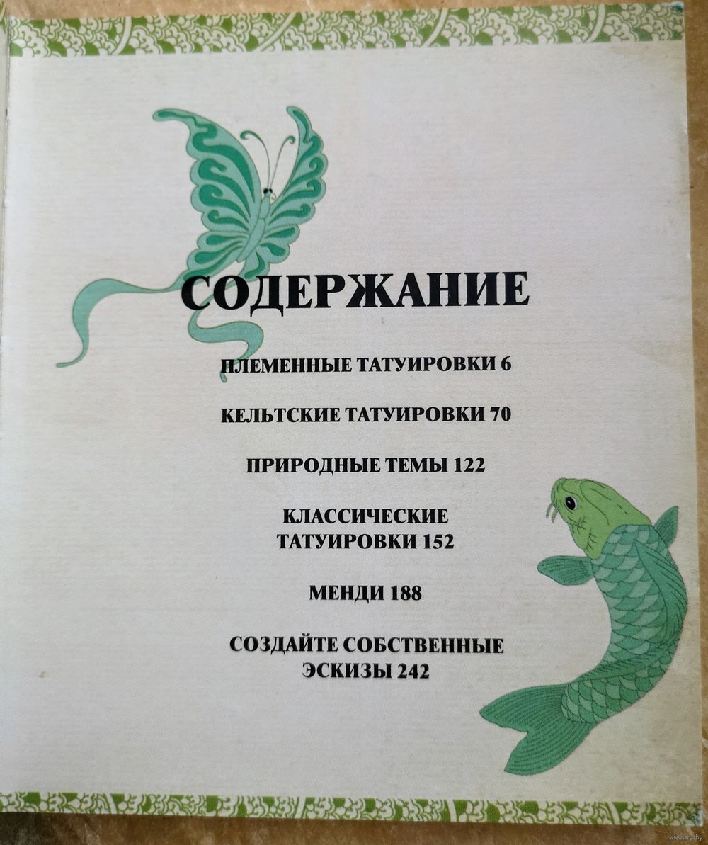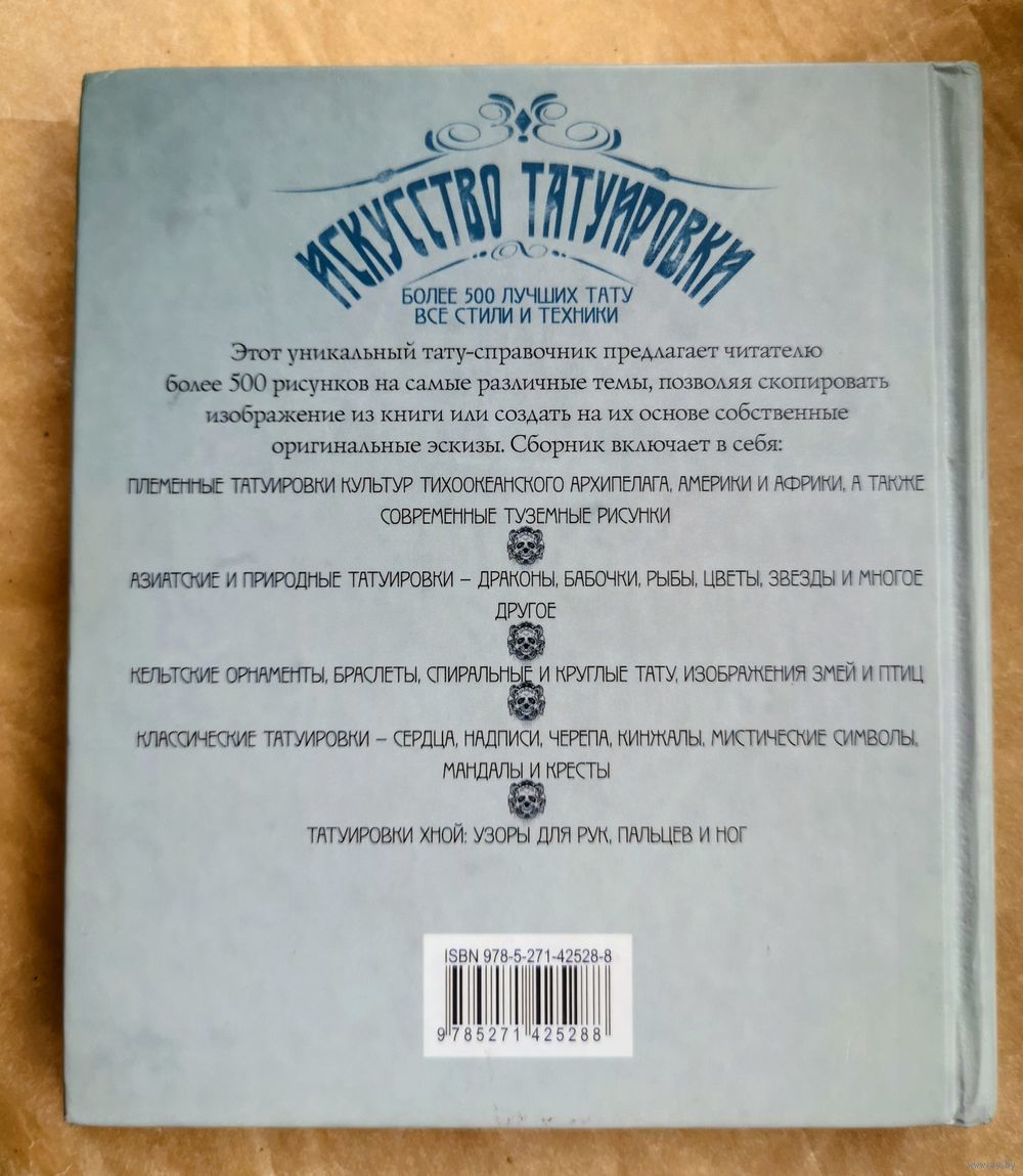 Этот уникальный тату-справочник предлагает читателю более 500 рисунков на самые различные темы, позволяя скопировать изображение из книги или создать на их основе собственные оригинальные эскизы. Сборник включает в себя племенные татуировки культур Тихоокеанского архипелага, Америки и Африки, а также современные туземные рисунки, азиатские и природные татуировки — драконы, бабочки, рыбы, цветы, звезды и многое другое, кельтские орнаменты, браслеты, спиральные и круглые тату, изображения змей и птиц, классические татуировки — сердца, надписи, черепа, кинжалы, мистические символы, мандалы и кресты, татуировки хной: узоры для рук, пальцев и ног.