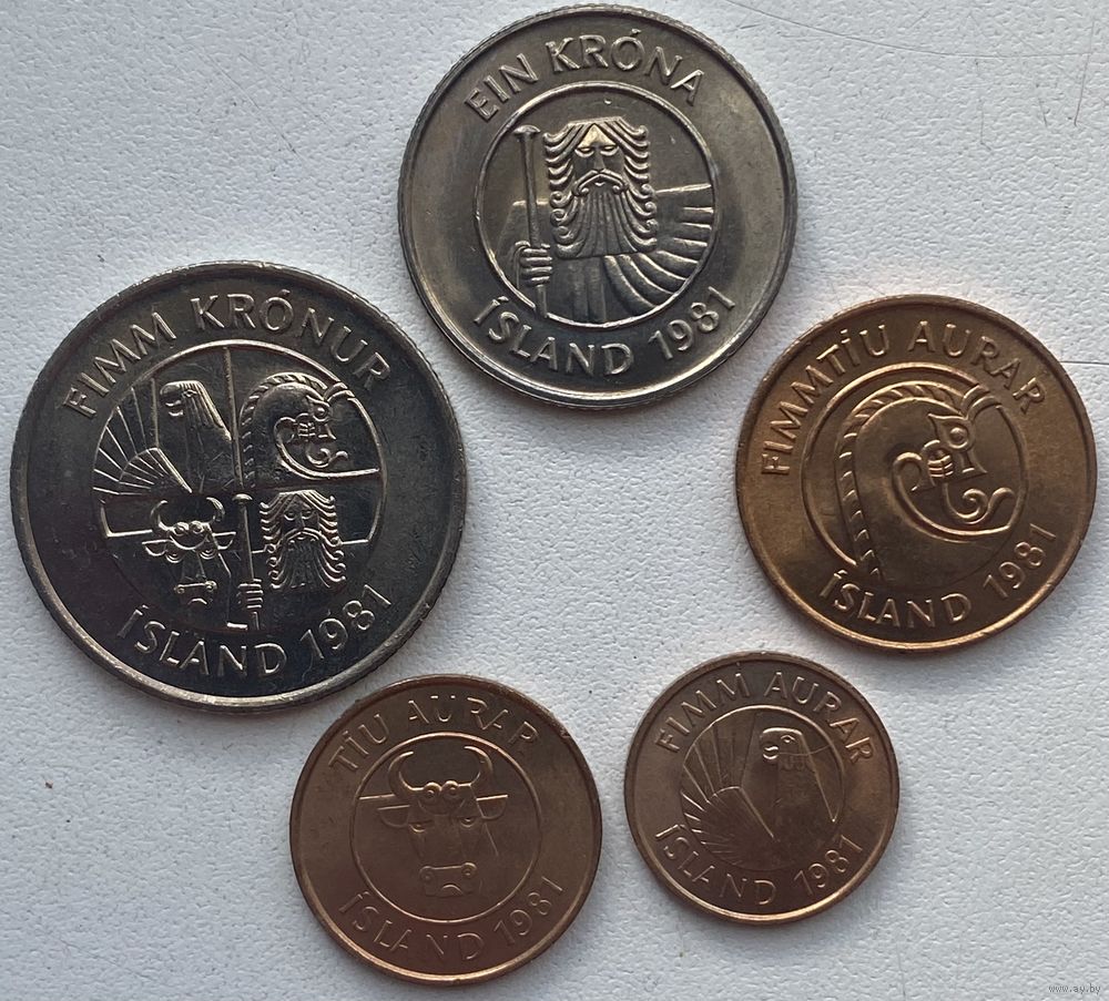 Исландия 5, 10, 50 эйре, 1, 5 крон 1981 г. Набор 5 монет