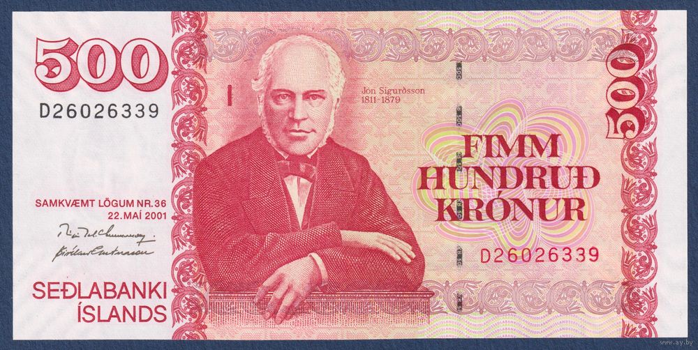 Исландия, 500 крон 2001 г., P-58a(1) (D, учёный Йоун Сигюрдссон), UNC