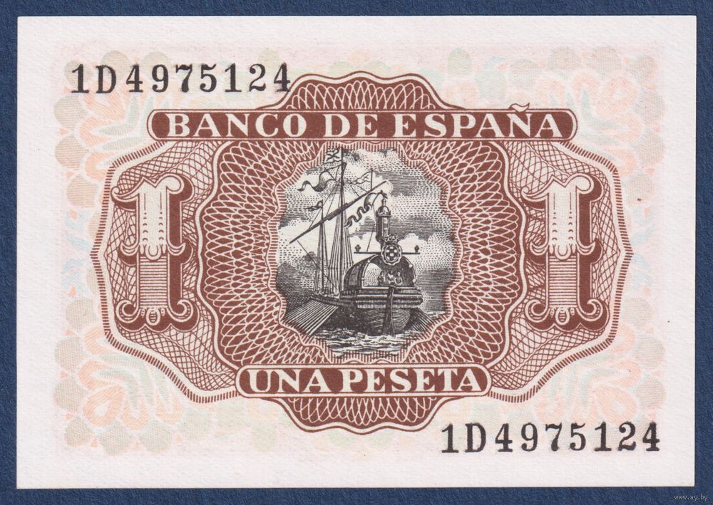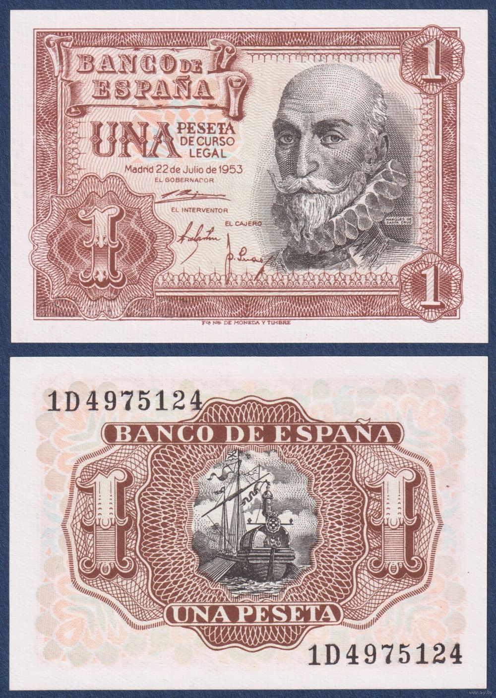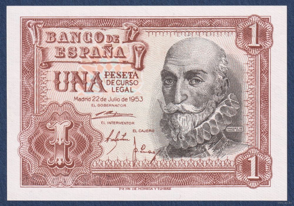 Испания, 1 песета 1953 г., P-144 (1D, адмирал Альваро де Басан-и-Гусман), UNC