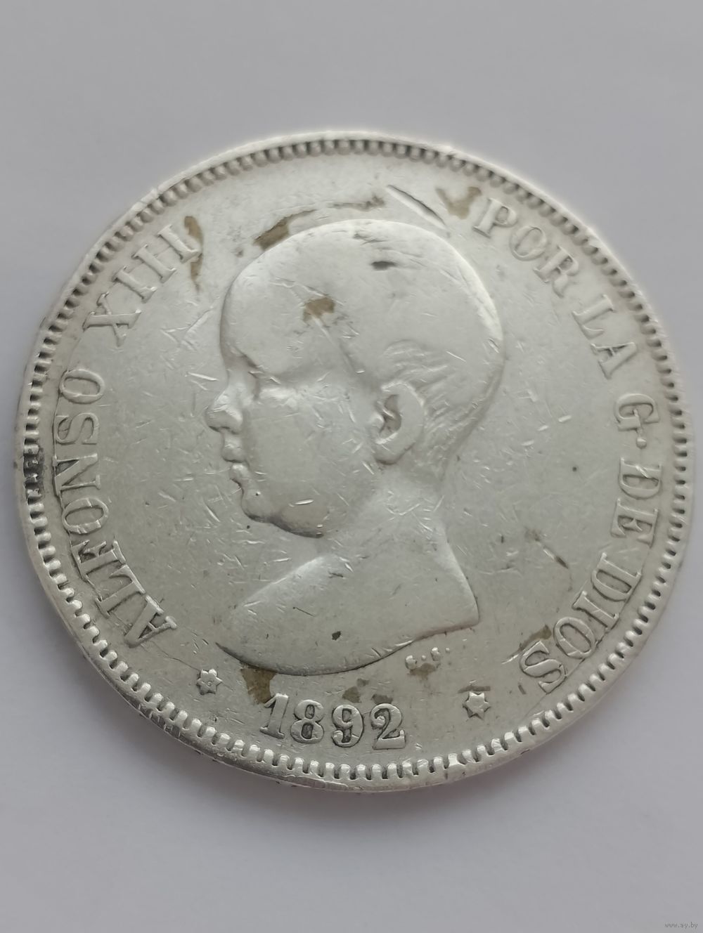 Испания 5 песет 1892 года. Король Альфонсо ХIII. Серебро