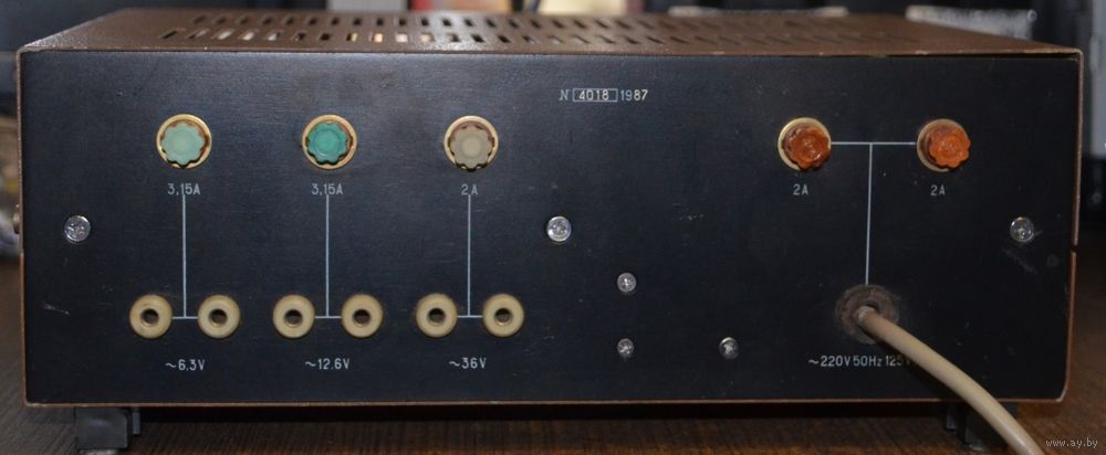 Источник питания универсальный с 1987 года выпускал Минский завод ''Калибр''. Источник предназначен для применения радиолюбителями при изготовлении, настройке и эксплуатации различных радиолюбительских конструкций на п/п приборах и микросхемах. Технические параметры ИПУ: Выходное напряжение, В/ток нагрузки max, А: стабилизированное регулируемое 3...30/1,5. Нестабилизированное переменное (соответств.) 6,3/3; 12,6/3; 36/1,5. Максимальный ток нагрузки, А: стабилизированного напряжения 1,5, нестабилизированных напряжений (соответственно) - 3; 1,5. Напряжение пульсаций выходного стабилизированного напряжения, не более, мВ - 20. Нестабильность для выходного стабилизированного напряжения при изменении напряжения сети на 10 % от номинального 220 В, не более, % ±0,5. Питание от сети переменного тока, В/Гц 220/50. Потребляемая мощность, не более, В*А 35. Габаритные размеры, мм 310x120x240. Масса блока, не более, кг 6,5.