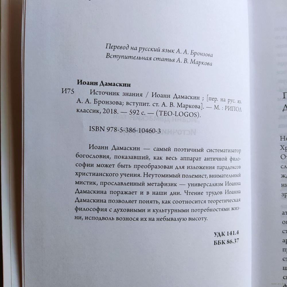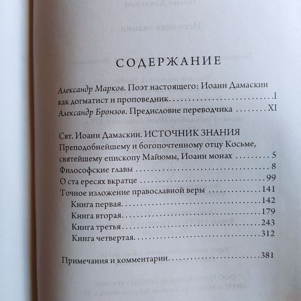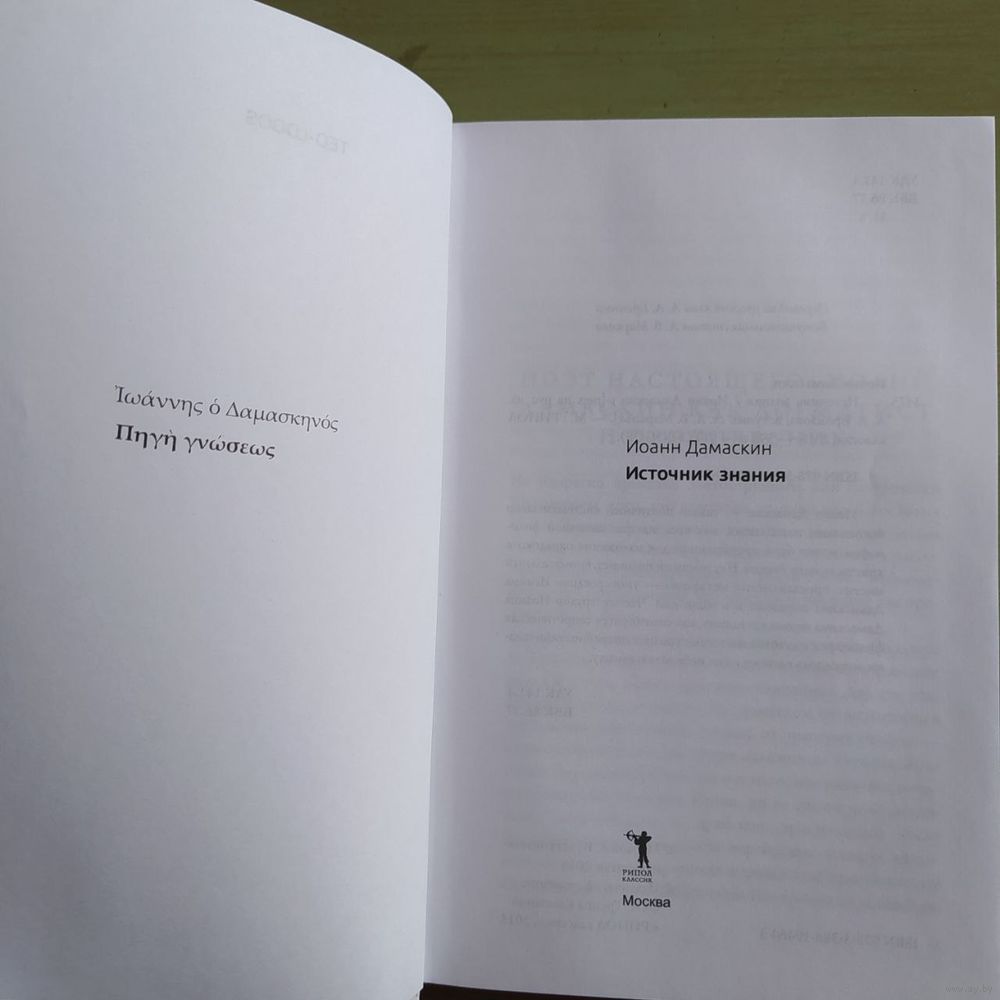 Работа, носящая заглавие «Источник знания», состоит из трех трактатов — «Философских глав», «Книги о ересях» и «Точного изложения православной веры». При этом «Точное изложение православной веры» занимает настолько первенствующее положение между остальными двумя, что эти последние в отношении к нему могут быть рассматриваемы в смысле вводных: «Философские главы» — в смысле философского введения, а «Книга о ересях» — в смысле исторического.