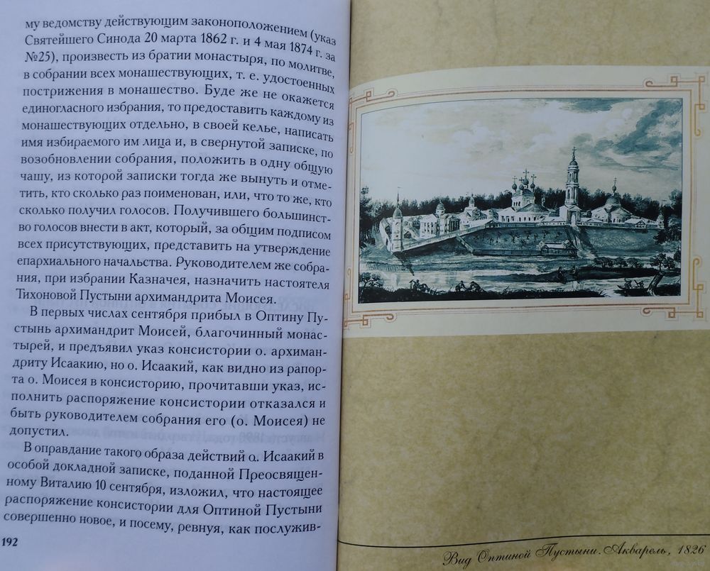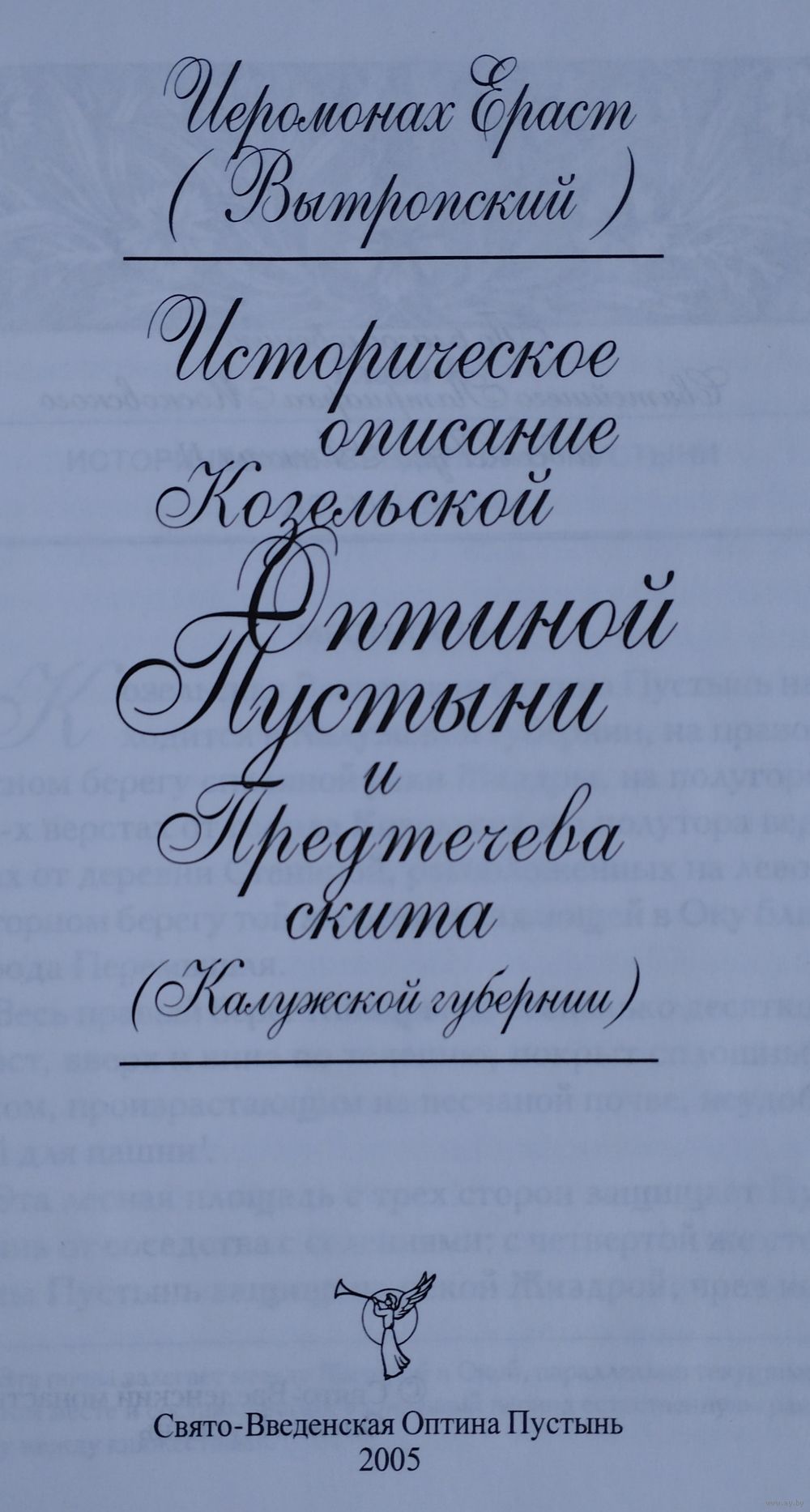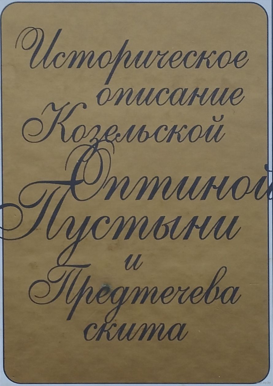 Большой формат. Тираж 5000 экз. 304 стр. Козельская Введенская Оптина пустынь находится в Калужской губернии, на правом лесном берегу сплавной реки Жиздры, на полугоре, в 3-х верстах от города Козельска и в 11/2 в. от деревни Стениной, расположенных на левом нагорном берегу той же реки (впадающей в р. Оку близ г. Перемышля). В исторические времена, при передвижении славянских племен с Юга, от отрогов Карпатских гор и Дуная, племя Вятичей, двигаясь от Днепра на север, заселило верховья рек Десны и Оки.