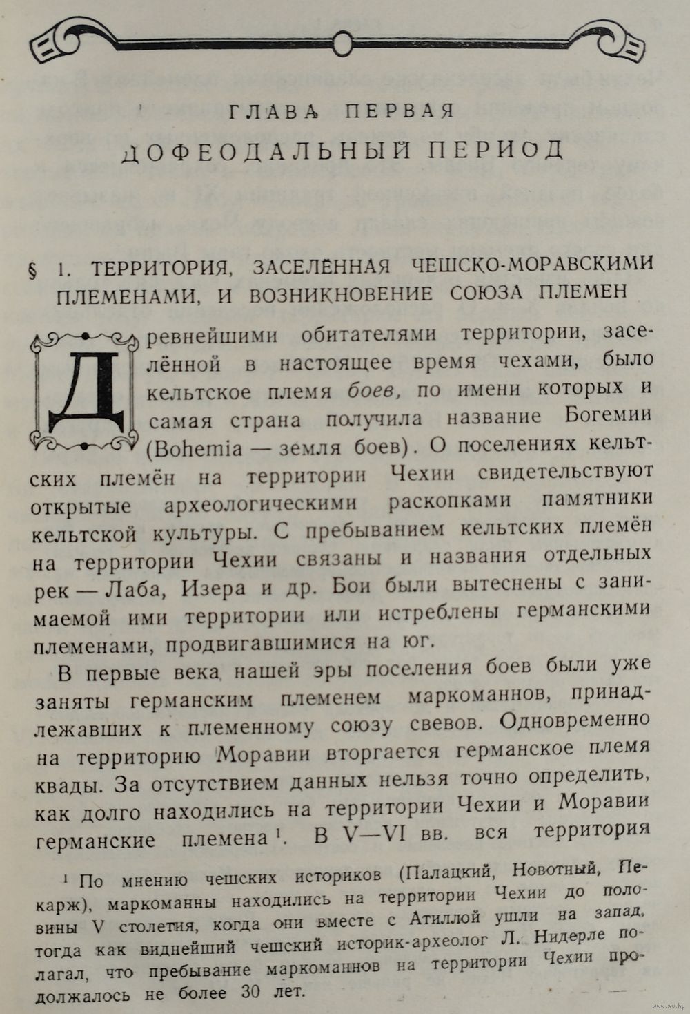 Тираж 20000 экз. 268 стр. Древнейшими обитателями территории, заселённой в настоящее время чехами, было кельтское племя боев, по имени которых и самая страна получила название Богемии (Bohemia - земля боев). О поселениях кельтских племён на территории Чехии свидетельствуют открытые археологическими раскопками памятники кельтской культуры. С пребыванием кельтских племён на территории Чехии связаны и названия отдельных рек - Лаба, Изера и др. Бои были вытеснены с занимаемой ими территории или истреблены германскими племенами, продвигавшимися на юг. В первые века нашей эры поселения боев были уже заняты германским племенем маркоманнов, принадлежавших к племенному союзу свевов. Одновременно на территорию Моравии вторгается германское племя квады. За отсутствием данных нельзя точно определить, как долго находились на территории Чехии и Моравни германские племена...