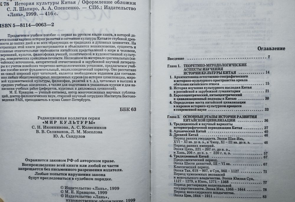 Тираж 3000 экз. 418 стр. Перед вами первая на русском языке книга, в которой дается полная картина истории развития и состояния культуры Китая от глубокой древности до наших дней и во всех образующих ее традициях и духовных ценностях. На страницах этой книги рассматриваются и объясняются возникновение, сущность и главные отличительные особенности китайских представлений о мире и человеке, верований, культов, философских учений, политической и художественной культуры, поведенческих принципов личности. Написанное на материале оригинальных (китайских) источников, авторитетной отечественной и зарубежной научной литературы и с учетом новейших теоретико-методологических установок, предлагаемое учебное пособие носит фундаментальный, энциклопедический характер. Оно рассчитано на самый широкий круг читателей, является необходимым изданием для составления любых общегуманитарных лекционных курсов (по истории цивилизации, миро вой художественной культуры, философии, религий и т. д.), читаемых в высших и средних учебных заведениях, а также для подготовки к указанным курсам и для на писания учебных работ (рефератов, курсовых и дипломных сочинений).
