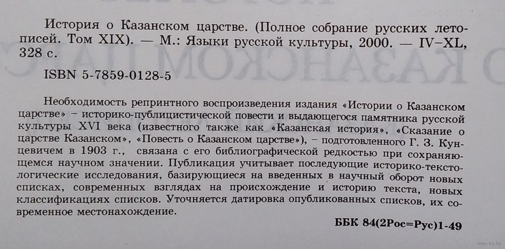 История о Казанском царстве. Полное собрание русских летописей. (ПСРЛ) том 19 Москва `Языки русской культуры` 2000г. 328 с. твердый тисненый переплет, энциклопедический формат.