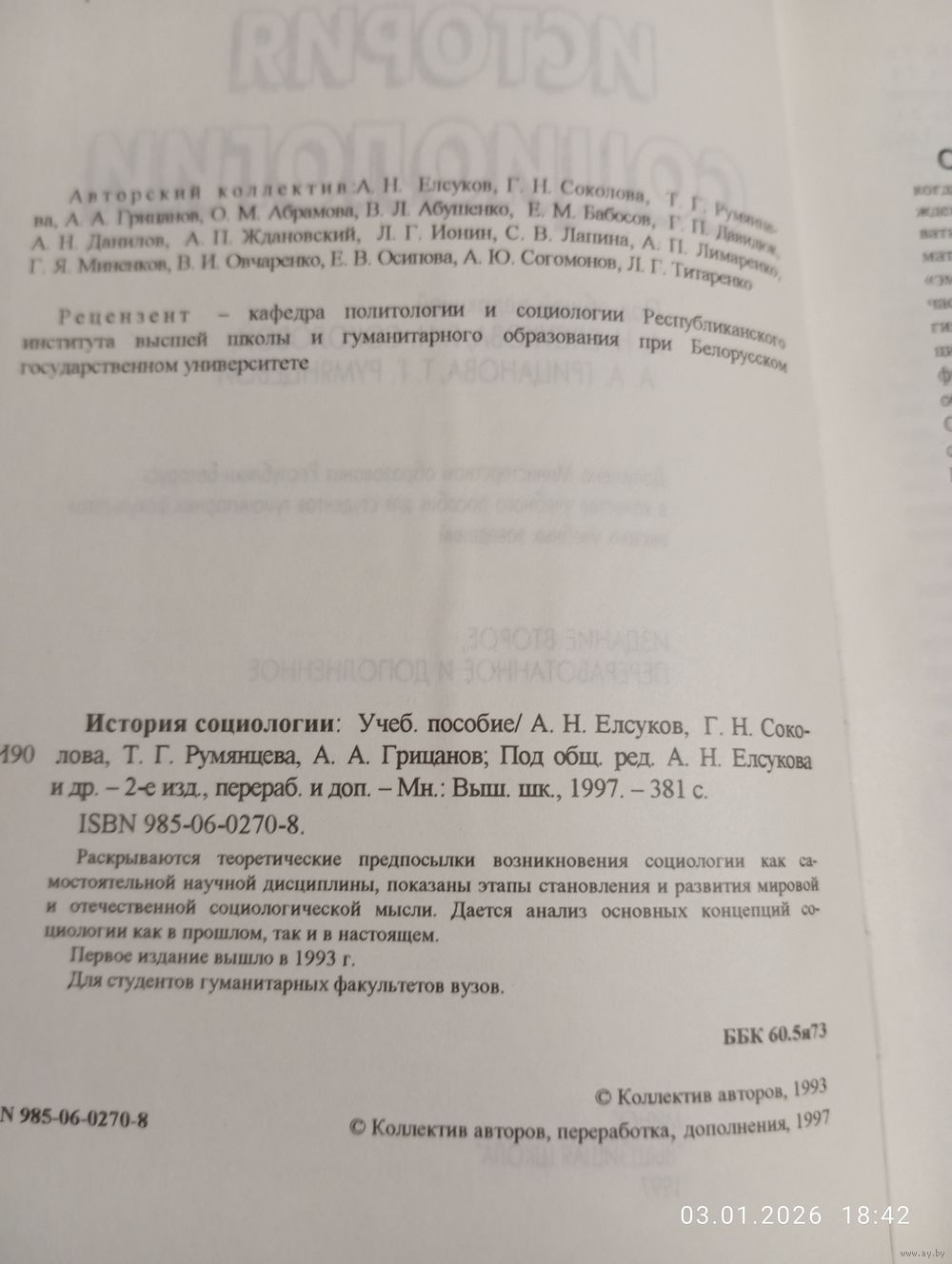 История социологии. Под ред Елсукова А. Мн. Вышэйшая школа 1997. В прекрасном состоянии, тв переплет. 381 с . Возможность отправки Белпочтой, полная предоплата