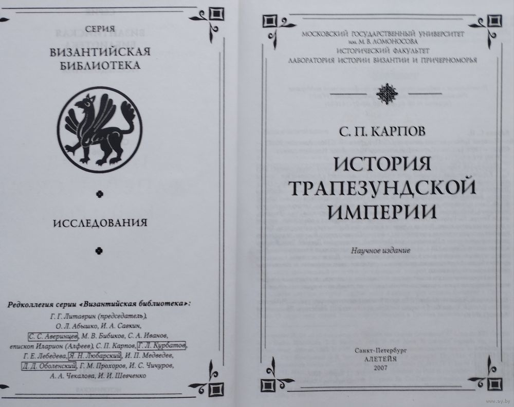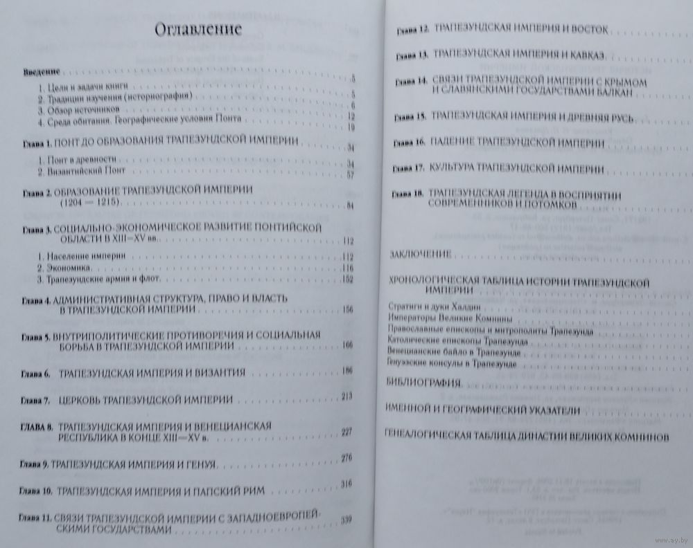 Большой энциклопедический формат. Тираж 2000 экз. 624 стр. Монография видного русского византиниста и медиевиста, академика РАН С. П. Карпова удостоено в 2009 г. золотой медали С. М. Соловьева – высшей награды РАН за достижения в области гуманитарных наук. В 2017 вышли ее переводы на греческий и турецкий языки. В книге детально рассмотрены все стороны политической, экономической и культурной истории Трапезундской империи (1204–1461). Трапезундская империя была колыбелью понтийского эллинизма, последним византийским оплотом, долгие годы – связующим звеном Запада и Востока, перекрестком мировых цивилизаций. Само выживание этого государства в эпоху Крестовых походов, татаро-монгольских завоеваний, возвышения могущественных держав Востока нуждается в объяснении, которое и предлагает автор книги. Видная и древняя митрополия Вселенского патриархата оставила заметный след в истории всего Православного Востока, поддерживая разносторонние связи с Палеологовской Византией, княжествами Древней Руси, Крымом и Закавказьем. С конца XIII в. на ее территории возникают генуэзские и венецианские фактории, игравшие важную роль в экономике Средневековья. Для исследования темы автор привлек широкий круг архивных, рукописных и опубликованных источников на многих европейских и восточных языках, а также памятники материальной культуры. Иллюстративный ряд книги содержит как фотографии памятников Понта в их нынешнем состоянии, так и материалы русской научной экспедиции в Трапезунд в 1916–17 гг, а также карты, таблицы, старинные рисунки и гравюры.