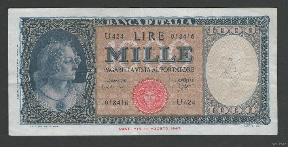 Италия 1000 лир 1961 года. Тип Р-88d. Состояние XF