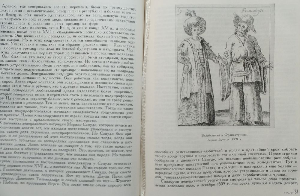 Большой формат. Тираж 4000 экз. 288 стр. Практика комедии дель арте дала европейскому театру много нового, а отдельные ее элементы и поныне живут в театральных формах Италии. Комедия дель арте представляет собою драгоценное наследие театральной культуры прошлого, подлежащее критическому изучению и способное обогащать живую сценическую действительность отдельными своими элементами. Изучение комедии дель арте может помочь более полному пониманию современного итальянского диалектального театра с его реалистической тенденцией и близостью к народу. Все сказанное делает понятным интерес к комедии дель арте как к одной из актуальных проблем театральной эстетики, а также как к определенному этапу развития театра.