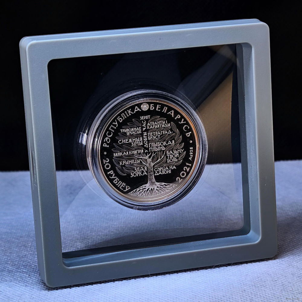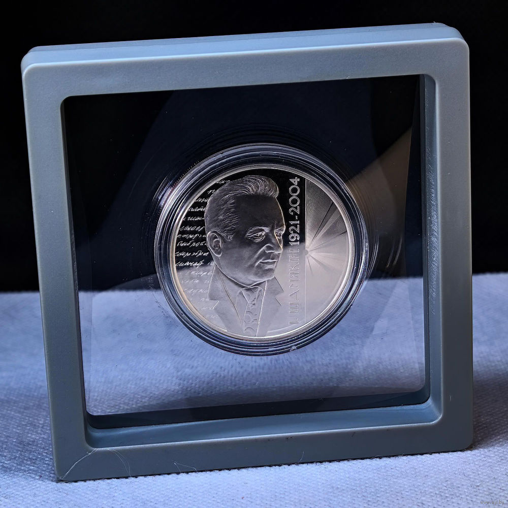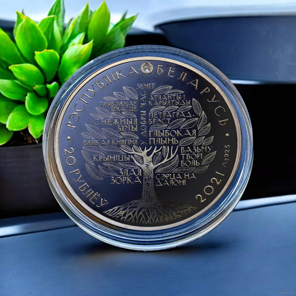 вверху – рельефное изображение Государственного герба Республики Беларусь; в центре – изображение дерева, символизирующего творчество Ивана Шамякина, в крону которого вплетены названия 12 романов писателя. Вокруг надпись: РЭСПУБЛІКА БЕЛАРУСЬ; внизу – номинал: 20 РУБЛЁЎ (на серебряной) и 1 РУБЕЛЬ (на медно-никелевой), год выпуска (на серебряной – проба сплава).