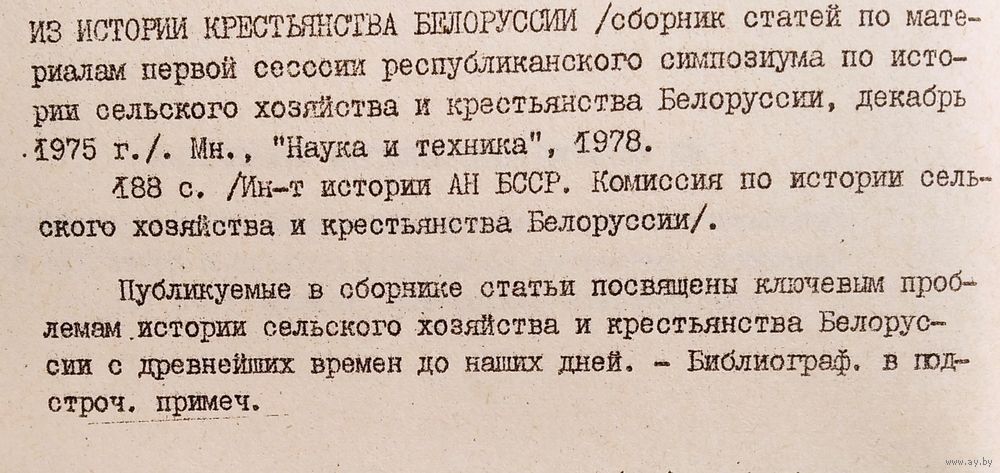 Из истории крестьянства Белоруссии: Сборник статей по материалам первой сессии республиканского симпозиума по истории сельского хозяйства и крестьянства Белоруссии, декабрь 1975 г. Редколлегия: К. И. Шабуня (ответственный редактор), П. Г. Козловский, А. А. Филимонов]. Минск : Наука и техника, 1978 г. 186 с. Мягкая обложка.