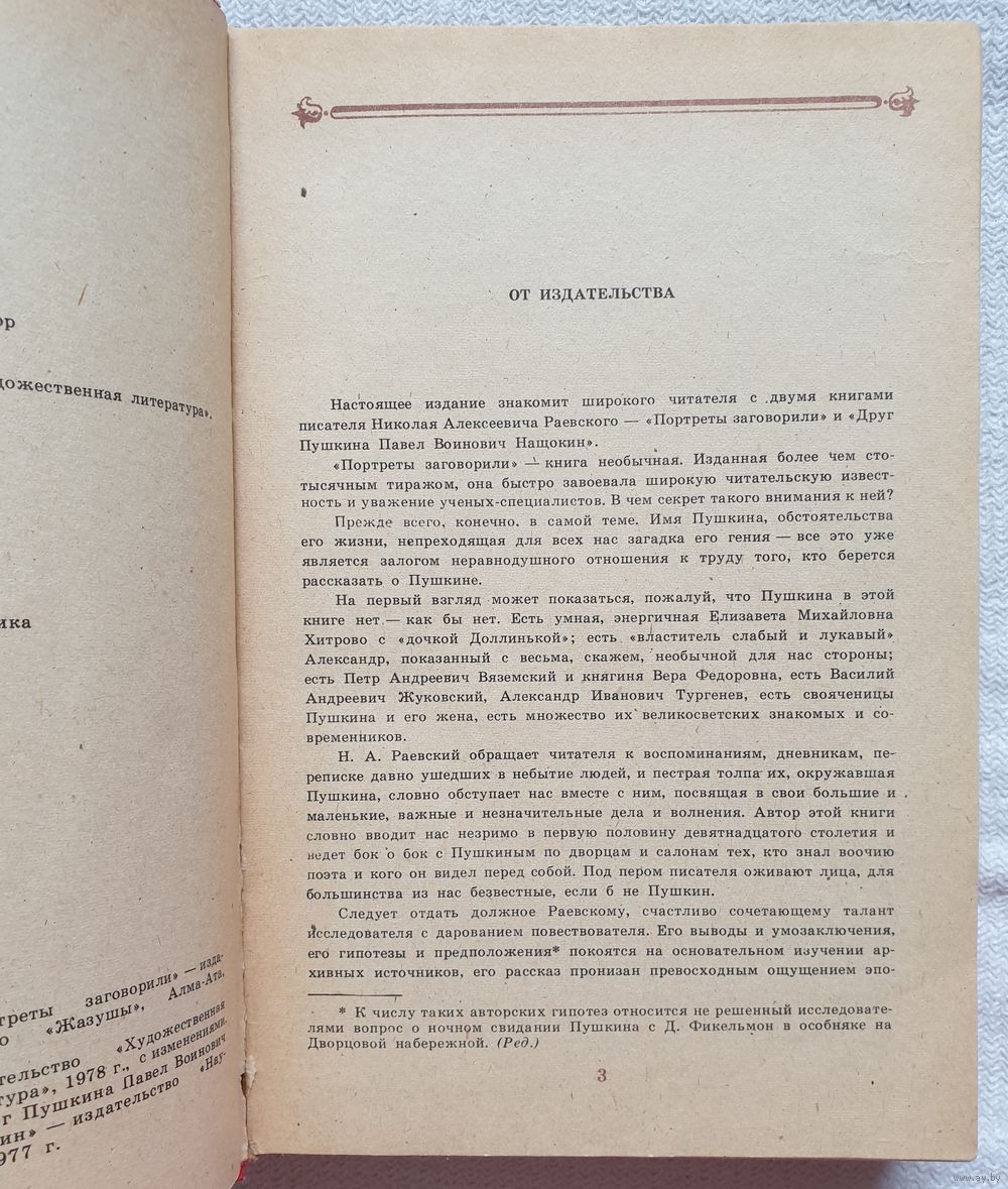 Исследования Н. А. Раевского в увлекательной форме рассказывают о людях и нравах первой половины XIX века, о некоторых друзьях и знакомых А. С. Пушкина.