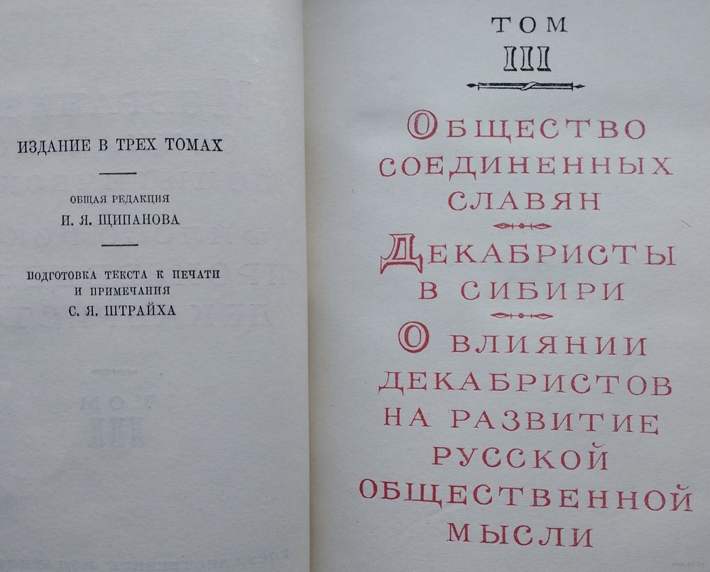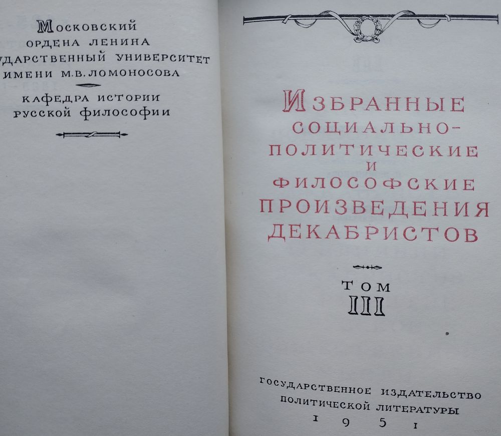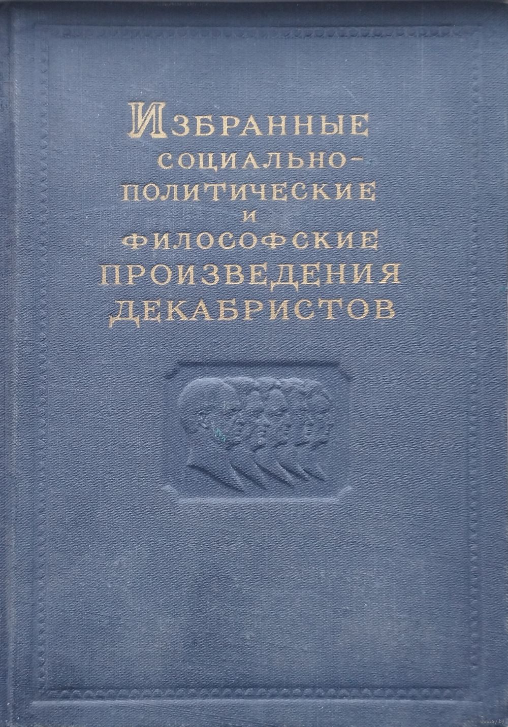 Цена за 1 том. Московский ордена Ленина государственный университет им. М. В. Ломоносова. Кафедра истории русской философии ; общая редакция и вступительная статья И. Я. Щипанова ; подготовка текста и примечаний С. Я. Штрайха. «Избранные социально-политические и философские произведения декабристов» — фундаментальное трехтомное издание 1951 года, приуроченное к 125-летию восстания. Оно содержит документы, программы и философские работы П.И. Пестеля, Н.М. Муравьева, М.С. Лунина, И.Д. Якушкина и других участников движения, освещая их взгляды на государственное устройство, крепостное право и философию.