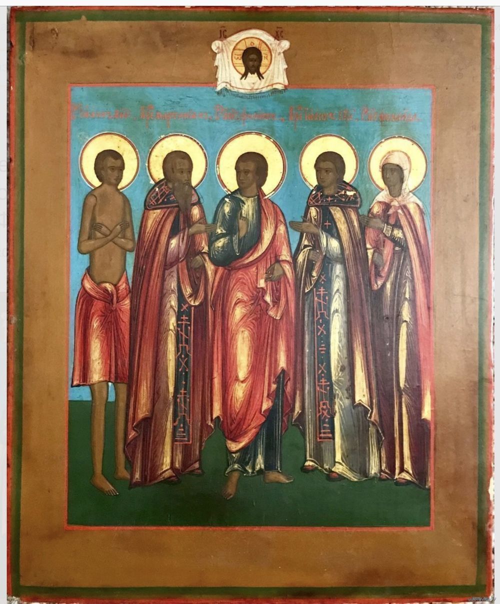 Избранные Святые: Иоанн Многострадальный, Преподобный Мартиниан, Апостол Филипп, Преподобный Иоанн Безмолвник, Святая мученица Фомаида. Центральная Россия, XIX век. Размеры: 26,5х21,5 см.