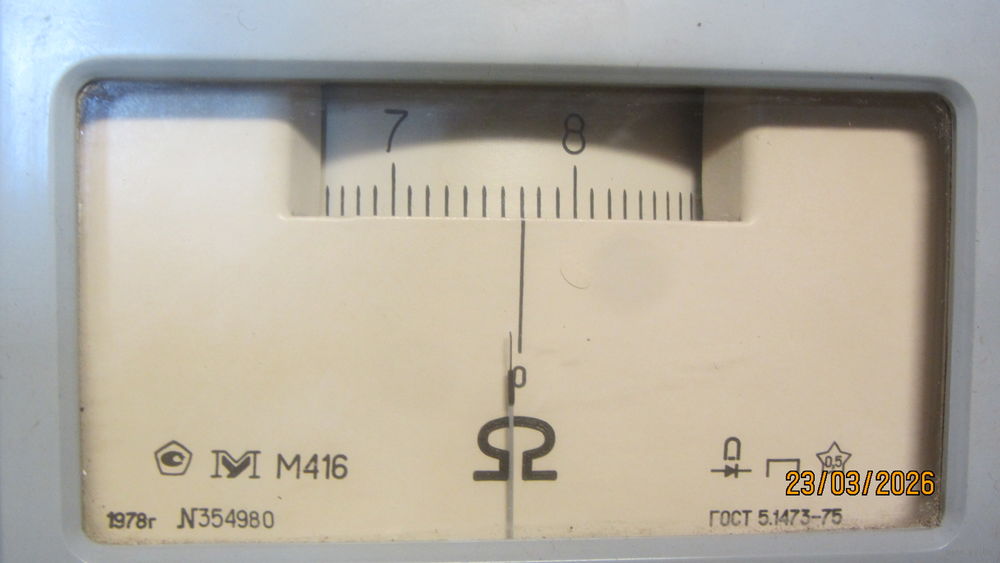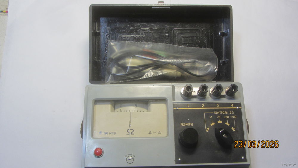 1978 г.в.,работоспособность проверена.С его помощью можно измерять сопроивления от 0,1-1000 Ом. В комплекте прибор,2 перемычки,измерительные провода(короткие),3 батареи D20( по 1,5В) . габариты: 245х140х160 мм,масса не более 3 кг.