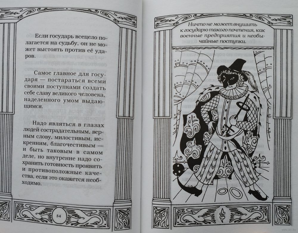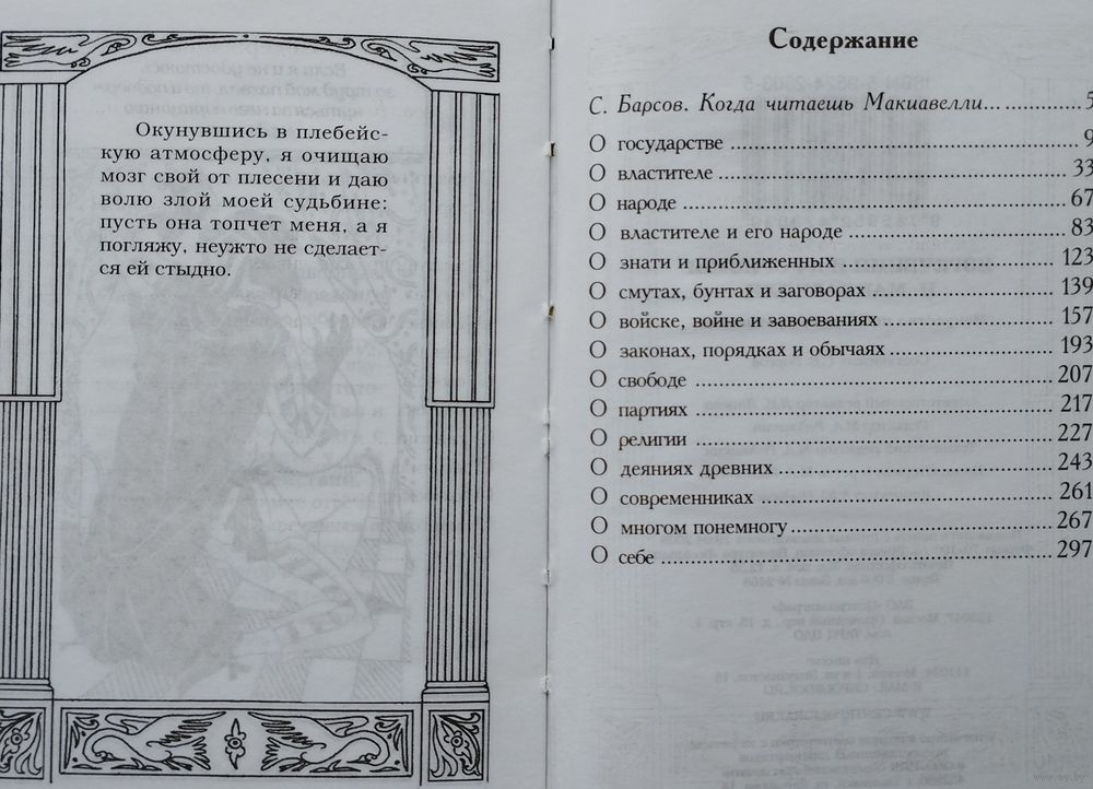 Тираж 5000 экз. 304 стр. Тиснение золотом, частичная лакировка. Эта книга - собрание тематических цитат из наследия политического мыслителя, историка и поэта итальянского Возрождения Никколо Макиавелли. Рассуждения родоначальника политологии касаются таких кардинальных вопросов, как "народ", "власть", "государство", "религия"... Предлагаются выдержки из "Истории Флоренции", трактата "Государь", труда "Рассуждения о первой декаде Тита Ливия" и других произведений.