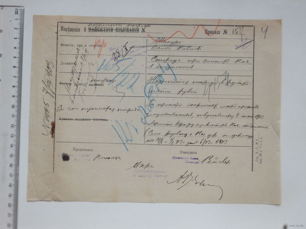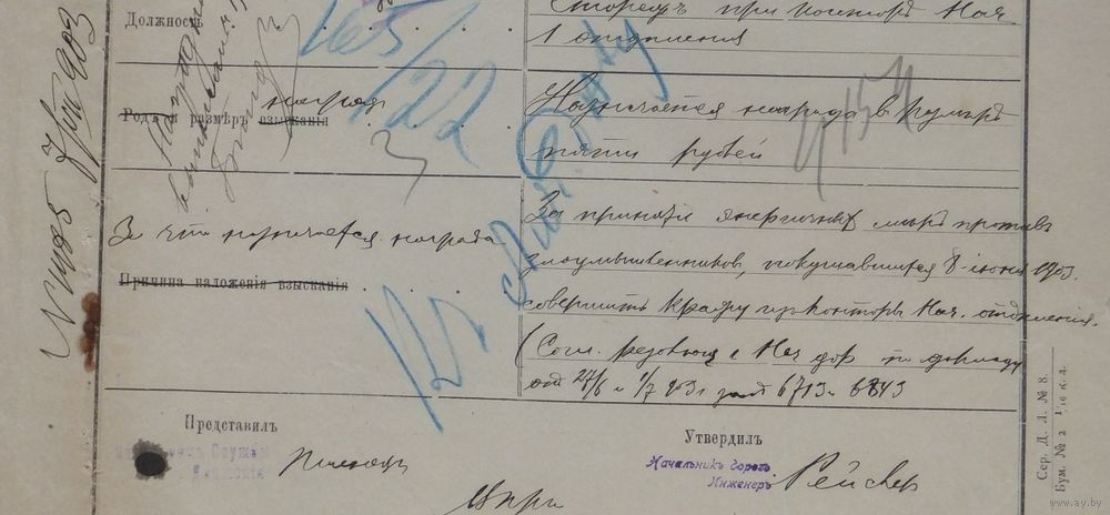 Извещение о назначение награды 1903 г Полесские Ж.Д.