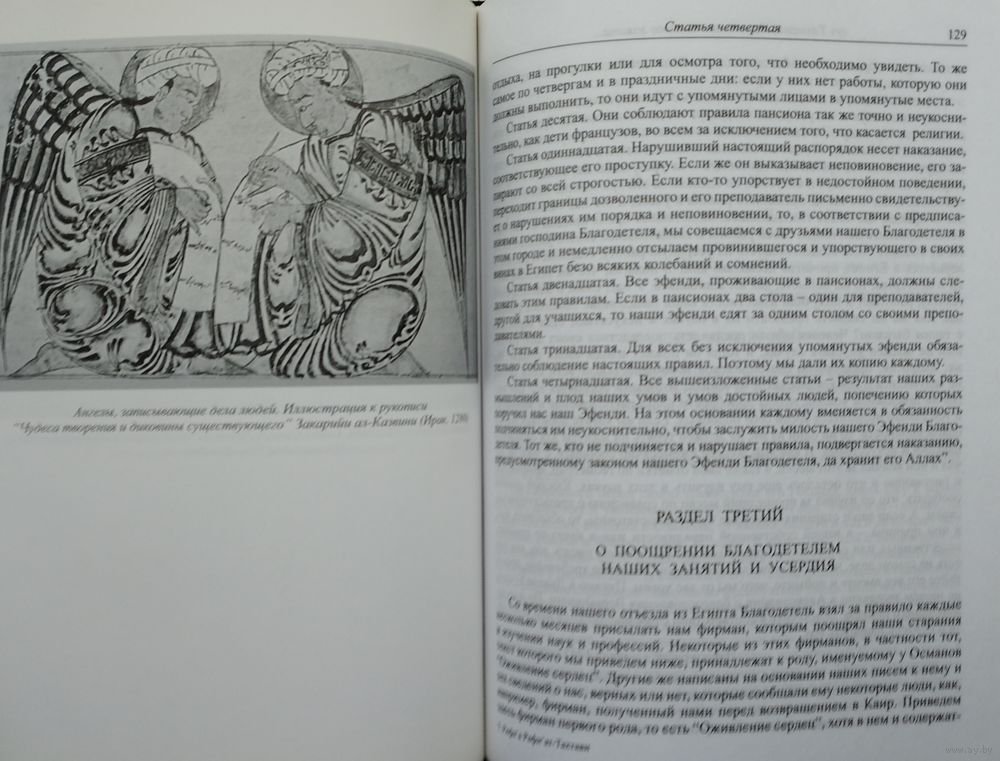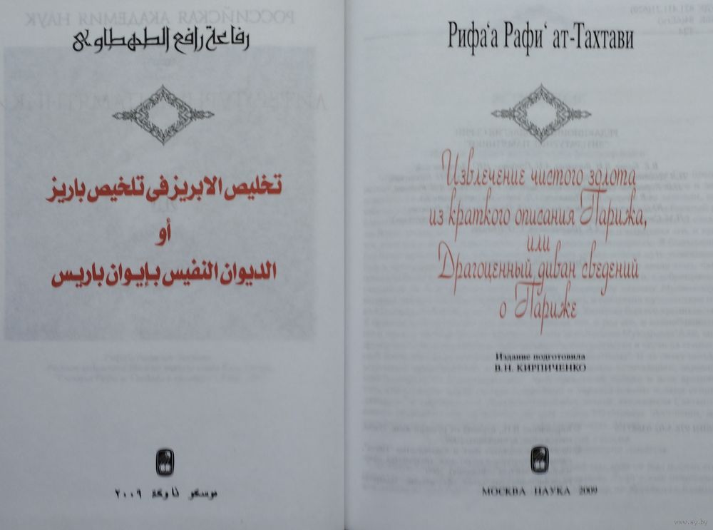 Большой формат. 272 стр. Шейх Рифа'а Рафи' ат-Тахтави (1801-1873), выпускник крупнейшего мусульманского университета ал-Азхар, находился в Париже с 1828 по 1831 г. в составе группы молодых египтян, отправленных правителем Египта Мухаммадом 'Али на учебу во Францию. Там он, следуя совету своего учителя, известного поэта и стилиста Хасана ал-'Аттара, написал большую часть книги, изданной в Каире в 1834 г. под названием "Извлечение чистого золота из краткого описания Парижа". В книге, своего рода краткой энциклопедии Парижа, ат-Тахтави, опираясь на прочитанные им в ходе учебы французские книги, на публикации в прессе и на собственные наблюдения, описывает повседневную жизнь парижан, их нравы, обычаи, характер, религиозные взгляды, профессиональные занятия, а также положение женщины в обществе, французские науки и искусства, общественный строй Франции, рассказывает о событиях июльской революции 1830 г. Его цель - познакомить египтян и "всех мусульман" с достижениями французов в области науки, техники и общественной жизни и содействовать тем самым движению своей страны по пути обновления и прогресса.