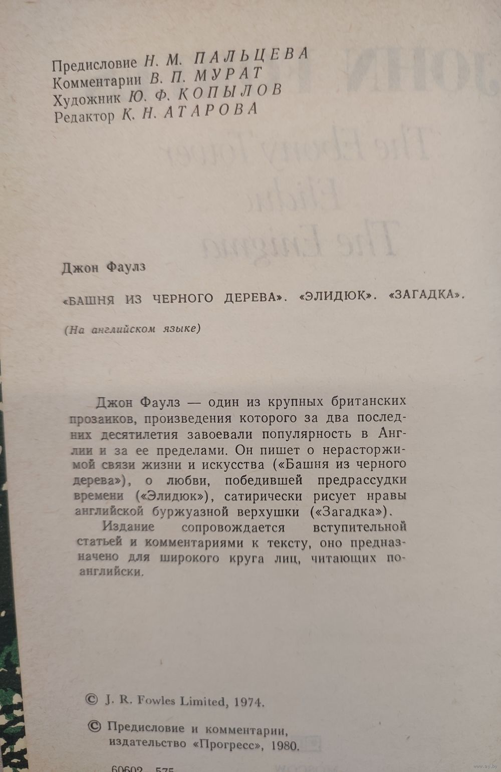 Джон Фаулз (1926–2005) – один из крупнейших британских прозаиков. Он писал о нерасторжимой связи жизни и искусства («Башня из черного дерева»), о любви, победившей предрассудки времени («Элидюк»), сатирически рисовал нравы английской буржуазной верхушки («Загадка»).