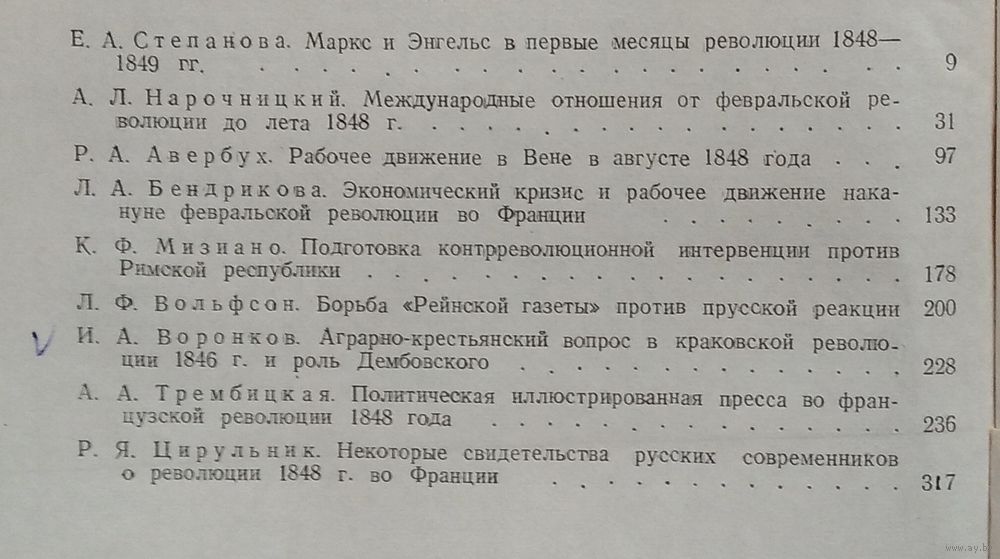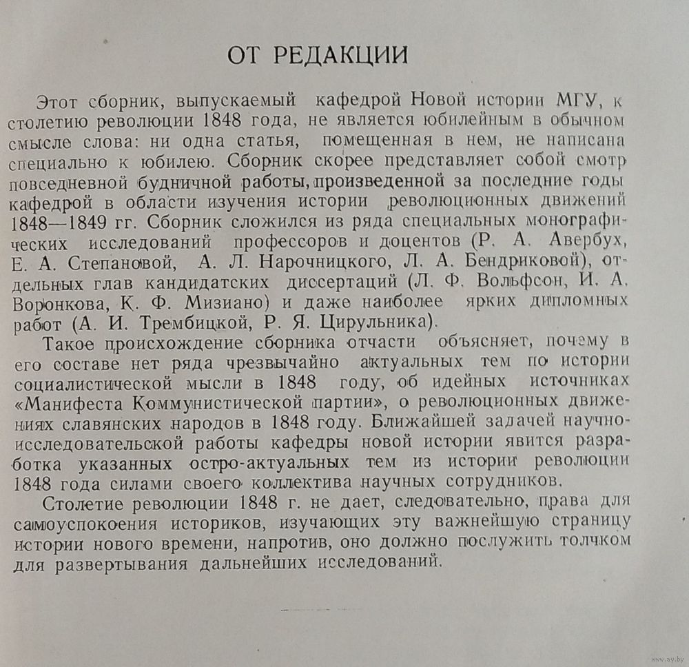 Содержание: -Степанова Е.А. `Маркс и Энгельс в первые месяцы революции 1848-1849 гг.`; -Нарочницкий А.Л. `Международные отношения от февральской революции до лета 1848 г.`; -Авербух Р.А. `Рабочее движение в Вене в августе 1848 года`; -Бендрикова Л.А. `Экономический кризис и рабочее движение накануне февральской революции во Франции`; -Мизиано К.Ф. `Подготовка контрреволюционной интервенции против Римской республики`; -Вольфсон Л.Ф. `Борьба `Рейнской газеты` против прусской реакции`; -Воронков И.А. `Аграрно-крестьянский вопрос в краковской революции 1846 г. и роль Дембовского`; -Трембицкая А.А. `Политическая иллюстрированная пресса во французской революции 1848 года`; -Цирульник Р.Я. `Некоторые свидетельства русских современников о революции 1848 г. во Франции`. Тир. 4 000 экз.