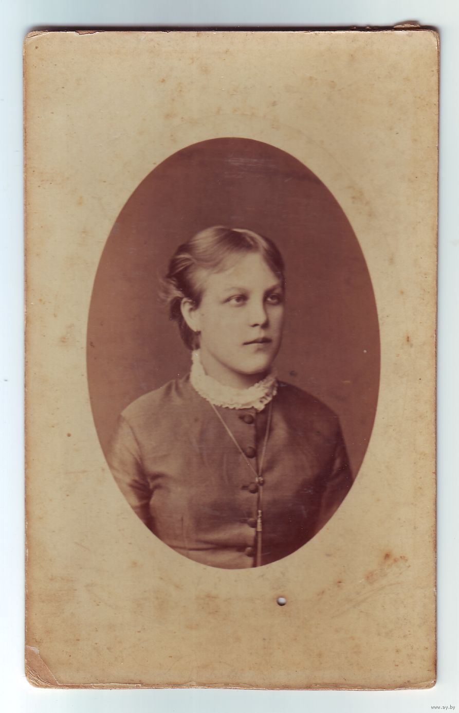 Кабинетное фото девушки, до 17го. Ателье- тиснение неразборчиво, размер: 16х10,2 см. Отверстие снизу овала.