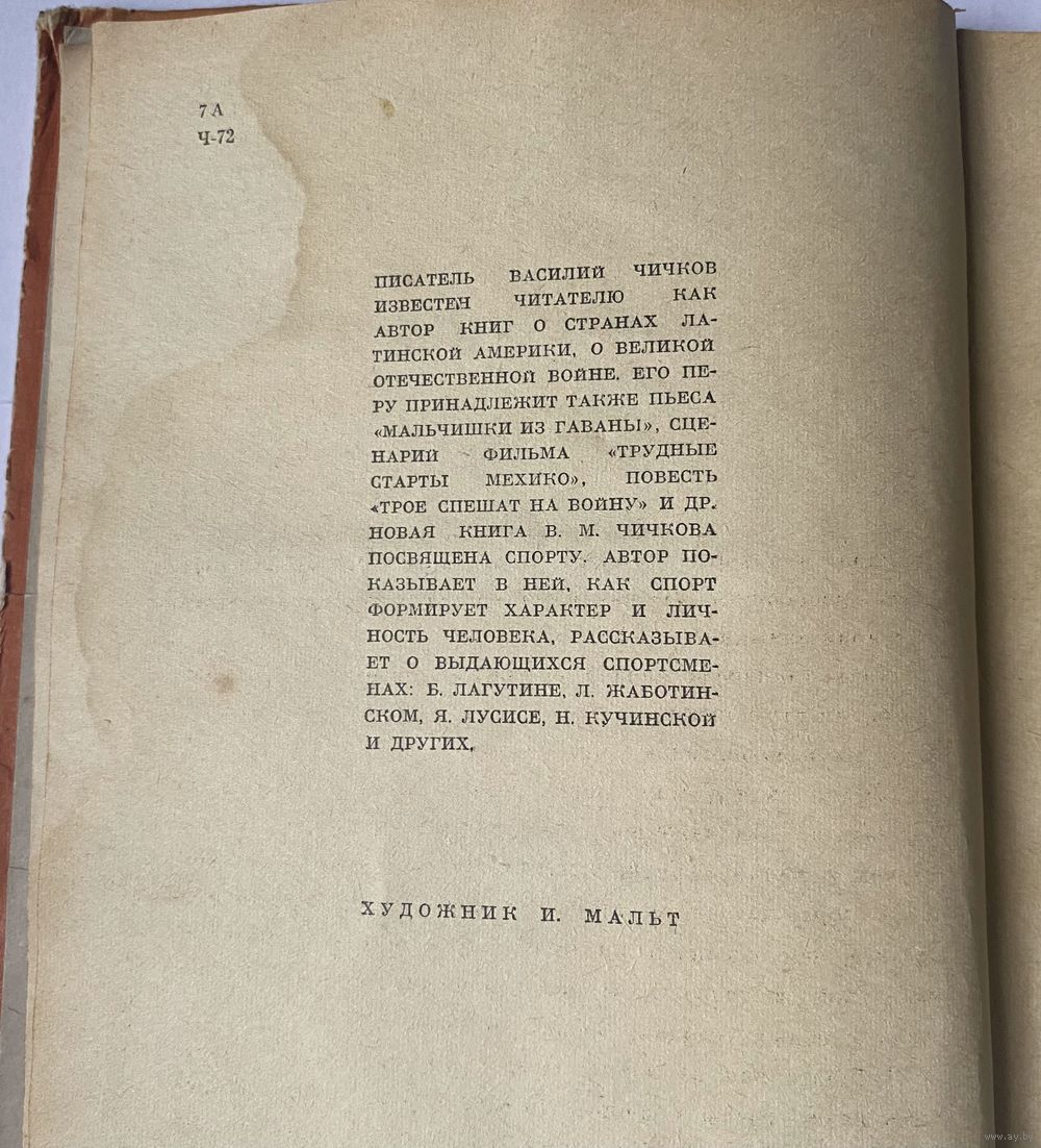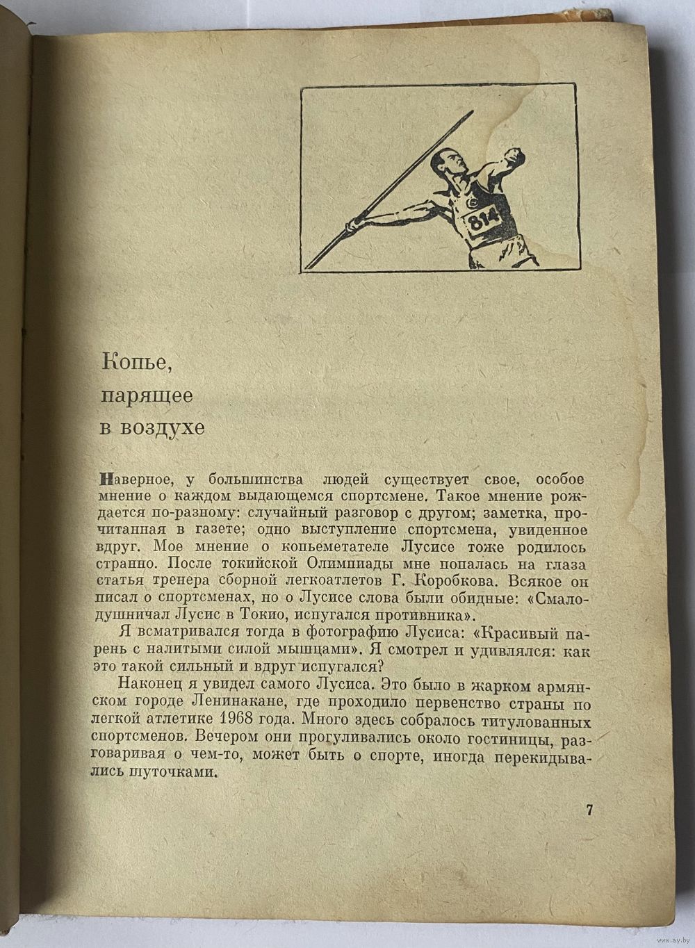 Книга посвящена спорту. Автор в ней рассказывает, как спорт формирует характер и личность человека. Рассказывает о выдающихся спортсменах: Б. Лагутине, л. Жаботинском, Я. Лусисе, Н. Кучинской и других