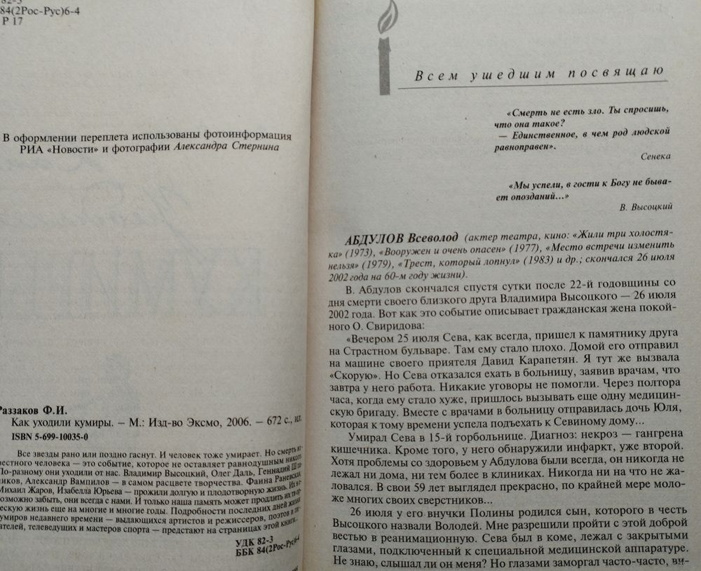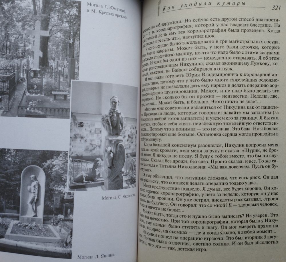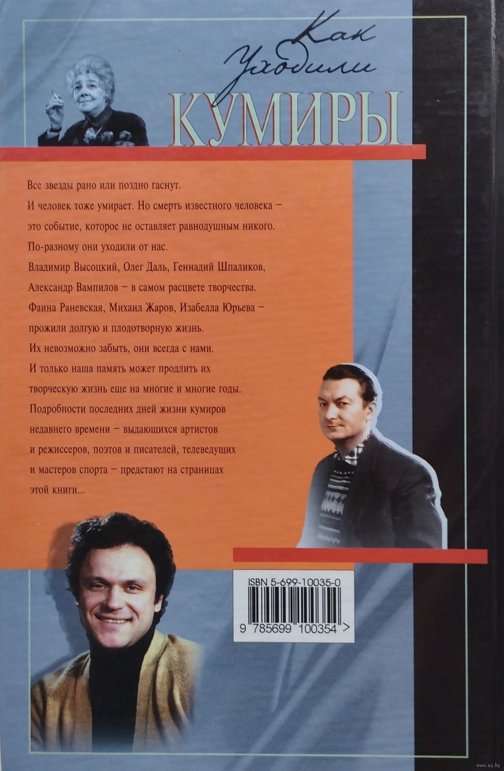 Большой формат. Тираж 3000 экз. 672 стр. Все звезды рано или поздно гаснут. И человек тоже умирает. Но смерть известного человека - это событие, которое не оставляет равнодушным никого. По-разному они уходили от нас. Владимир Высоцкий, Олег Даль, Геннадий Шпаликов, Александр Вампилов - в самом расцвете творчества. Фаина Раневская, Михаил Жаров, Изабелла Юрьева - прожили долгую и плодотворную жизнь. Их невозможно забыть, они всегда с нами. И только наша память может продлить их творческую жизнь еще на многие и многие годы. Подробности последних дней жизни кумиров недавнего времени - выдающихся артистов и режиссеров, поэтов и писателей, телеведущих и мастеров спорта - предстают на страницах этой книги...