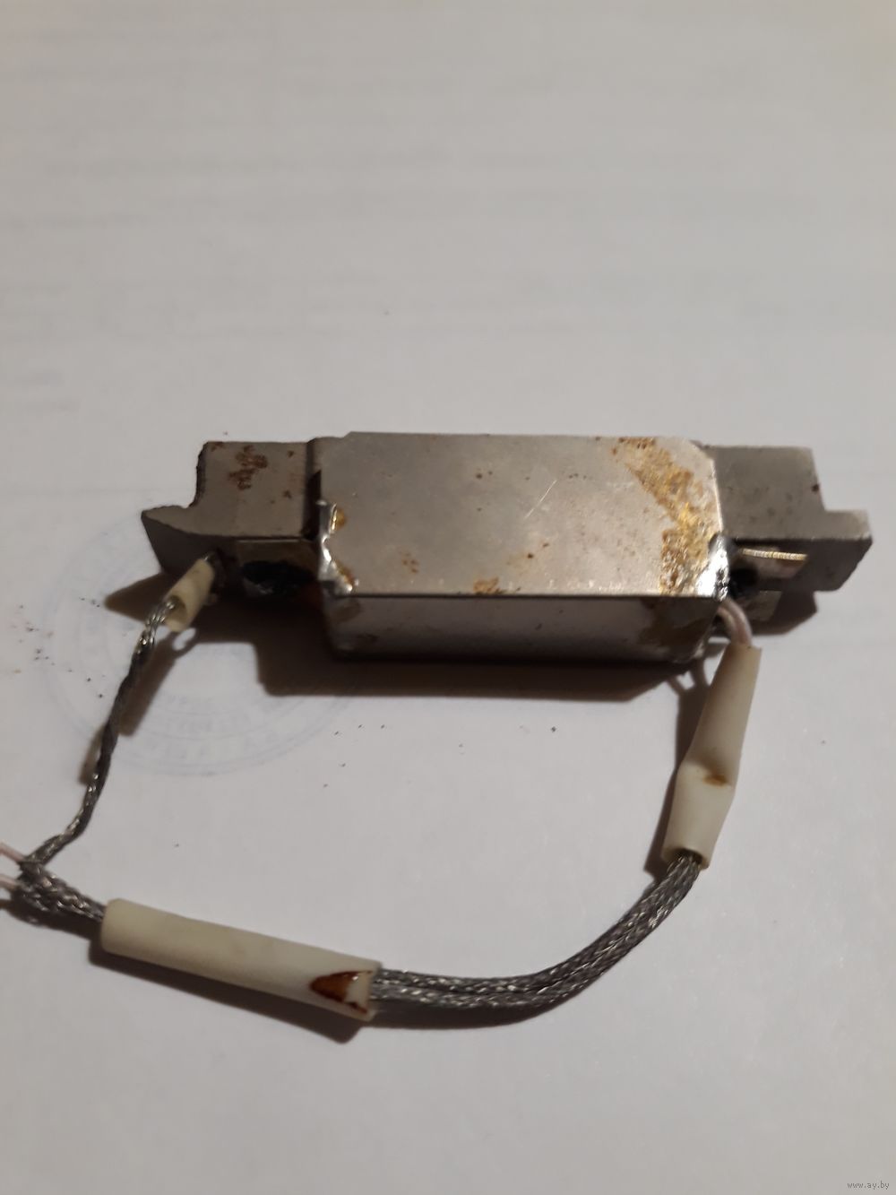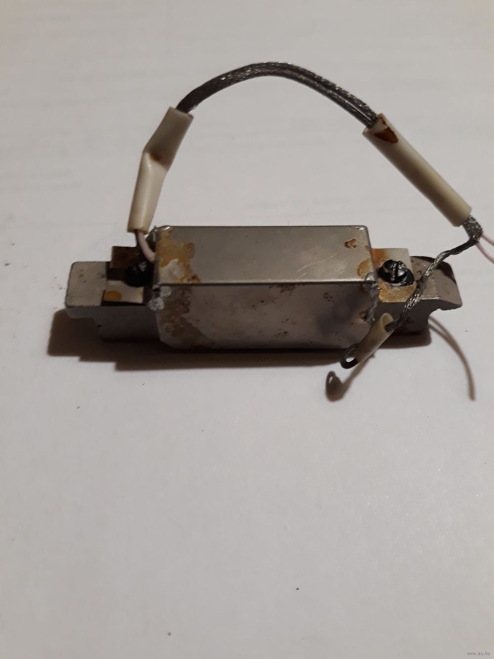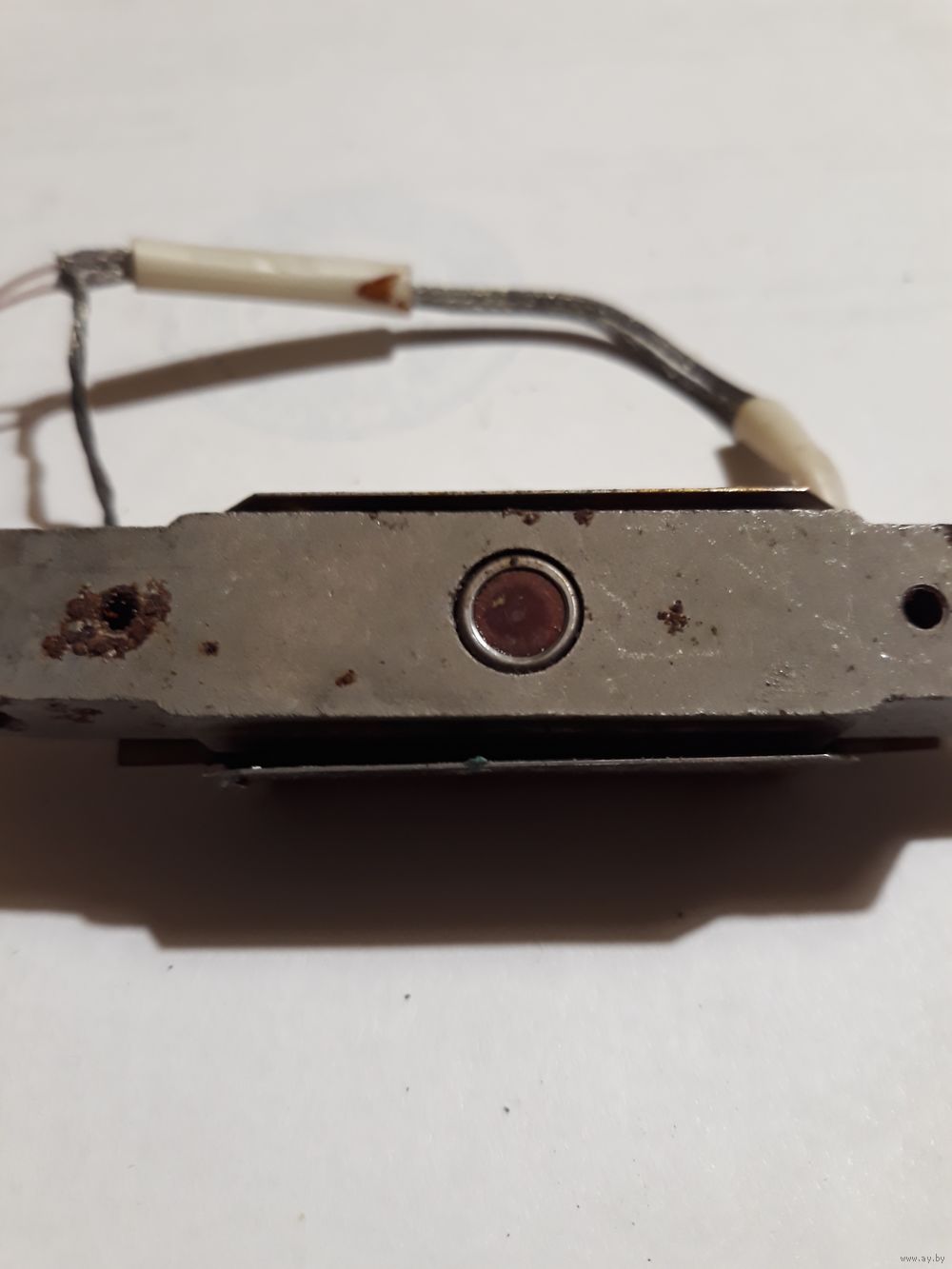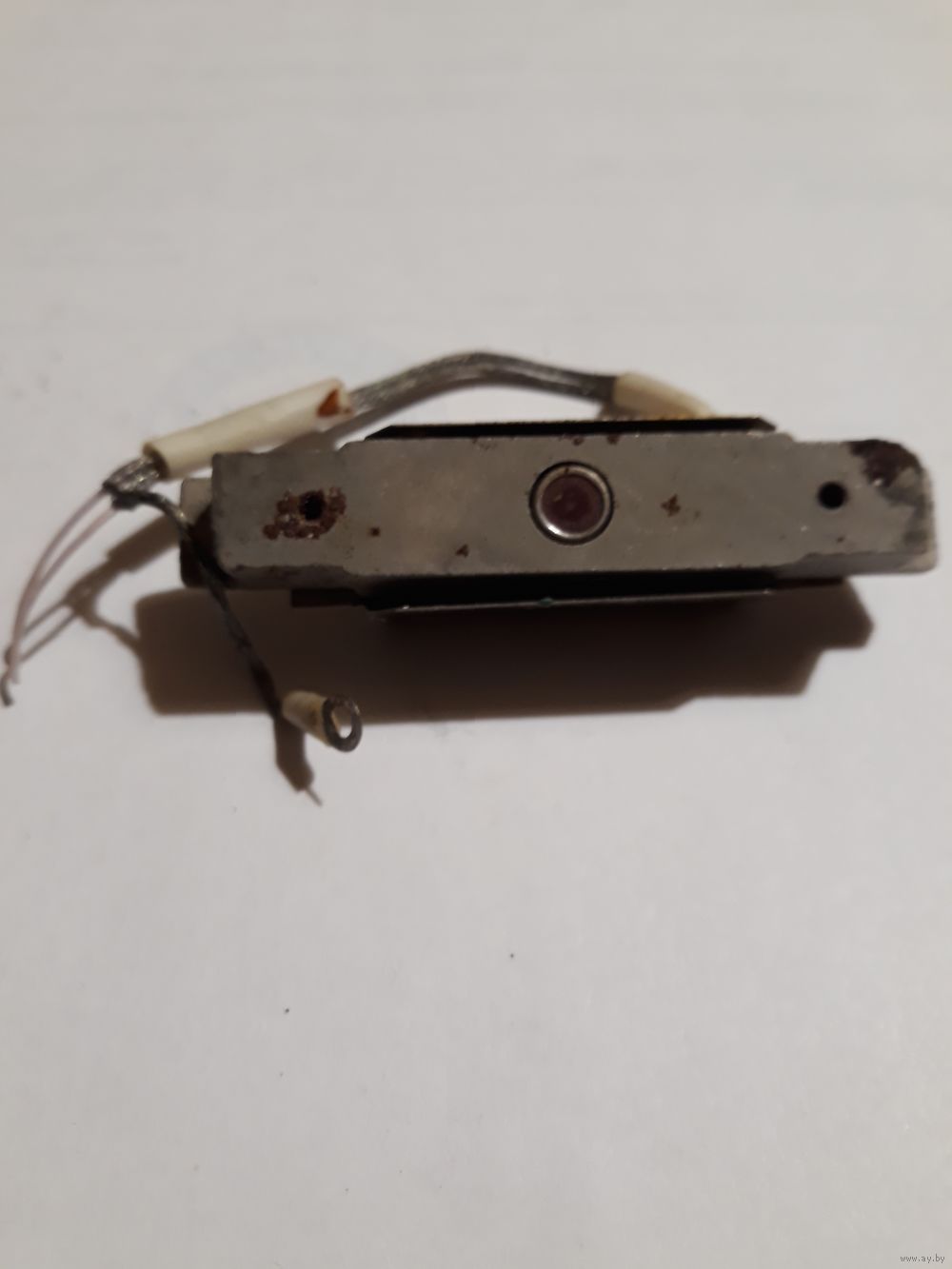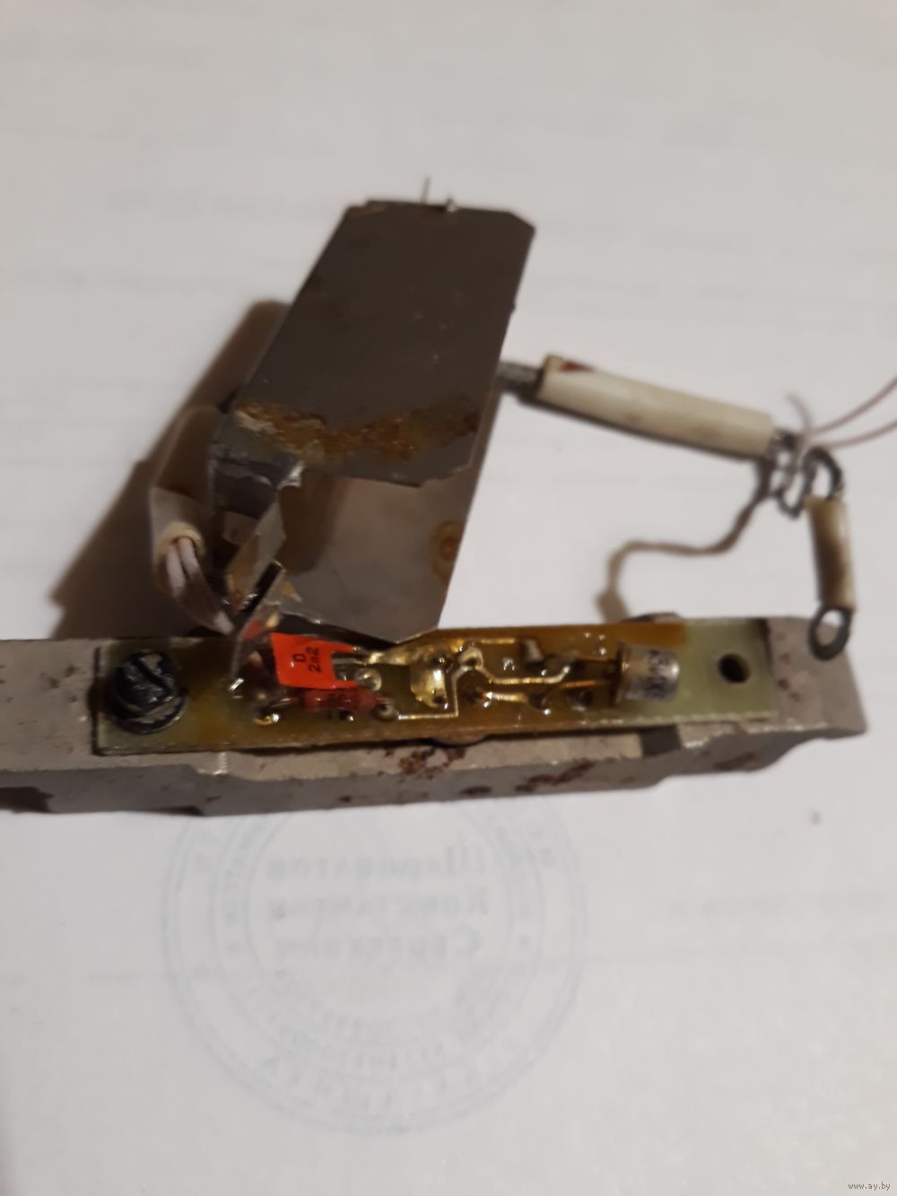 На металлической станине плата с танзистором и конденсатором закрытая экраном, с другой стороны в отверстии датчик (фотоэлемент? или что-то другое)