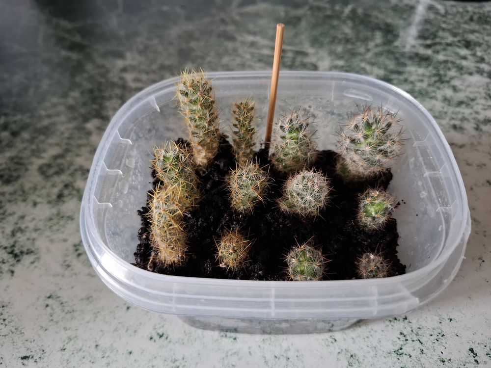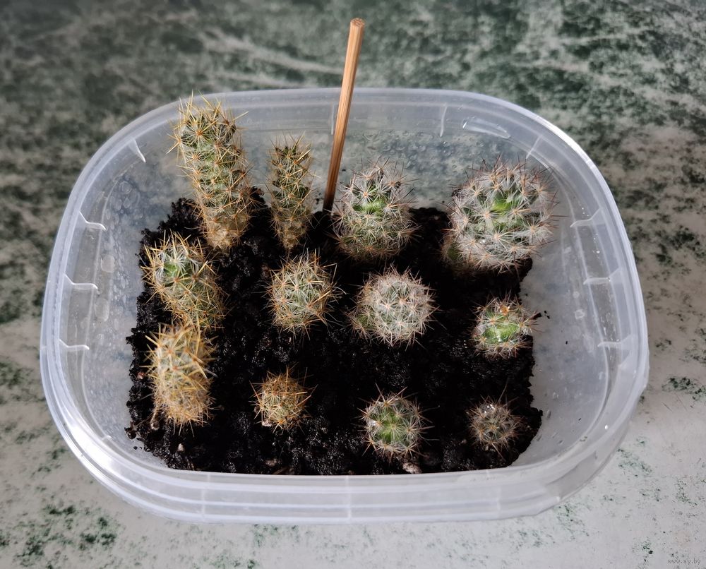 Продаются детки от разных кактусов. На фото вставлена половинка шпажки, она визуально разделяет виды кактусов и указывает на размер.