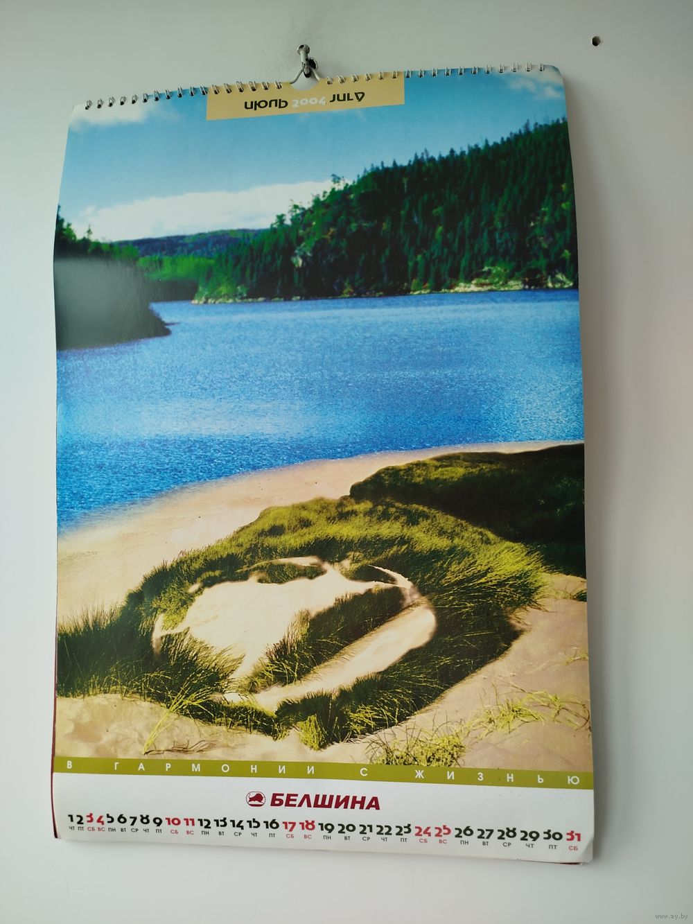 Настенный перекидной календарь ОАО "Белшина"( г.Бобруйск) на 2004 г. На каждом из 12 красочных пейзажей (по числу месяцев) можно увидеть фирменный логотип предприятия (Зубр в овале). Размер - 33х50 см.
